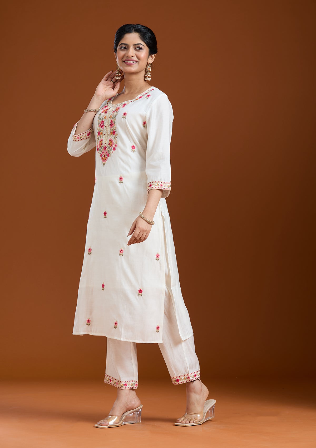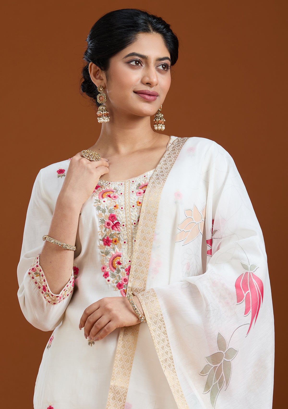 White Salwar Suit in Chanderi fabric. The Salwar Suit is embellished with Threadwork embroidery. Accompanied with a bottom and dupatta. Comes with the Koskii promise of premium quality.