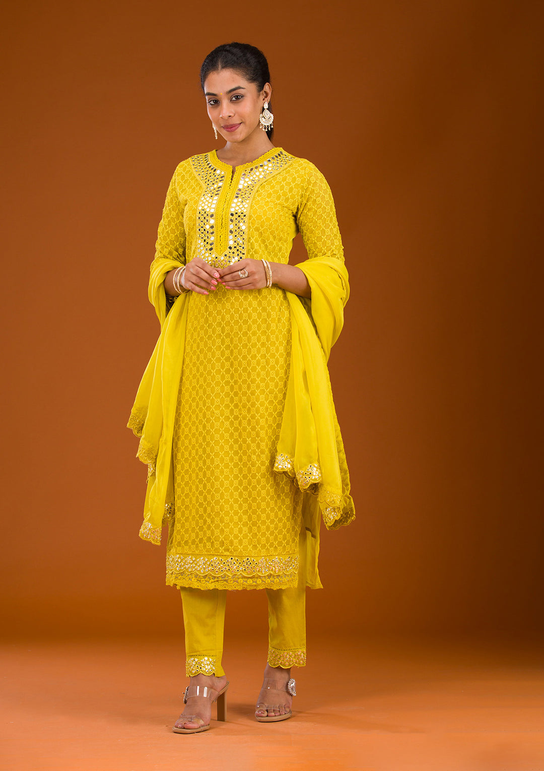 - Party wear: Dress up in glam fabrics like georgette or silk with a light dupatta to party in style. Go for a pista green georgette Anarkali suit with shimmery golden prints and a ruffled dupatta to flaunt your charm like a diva.