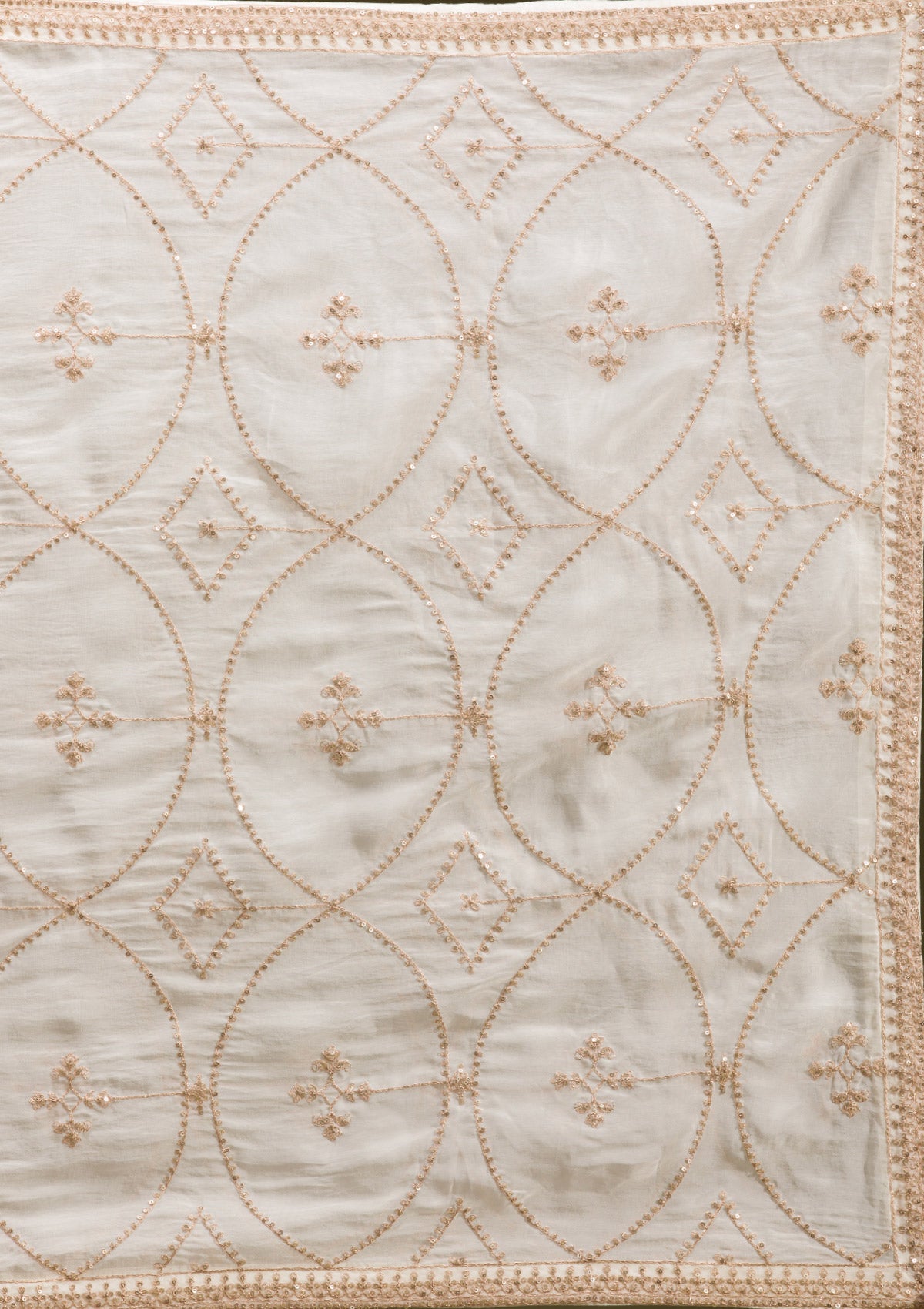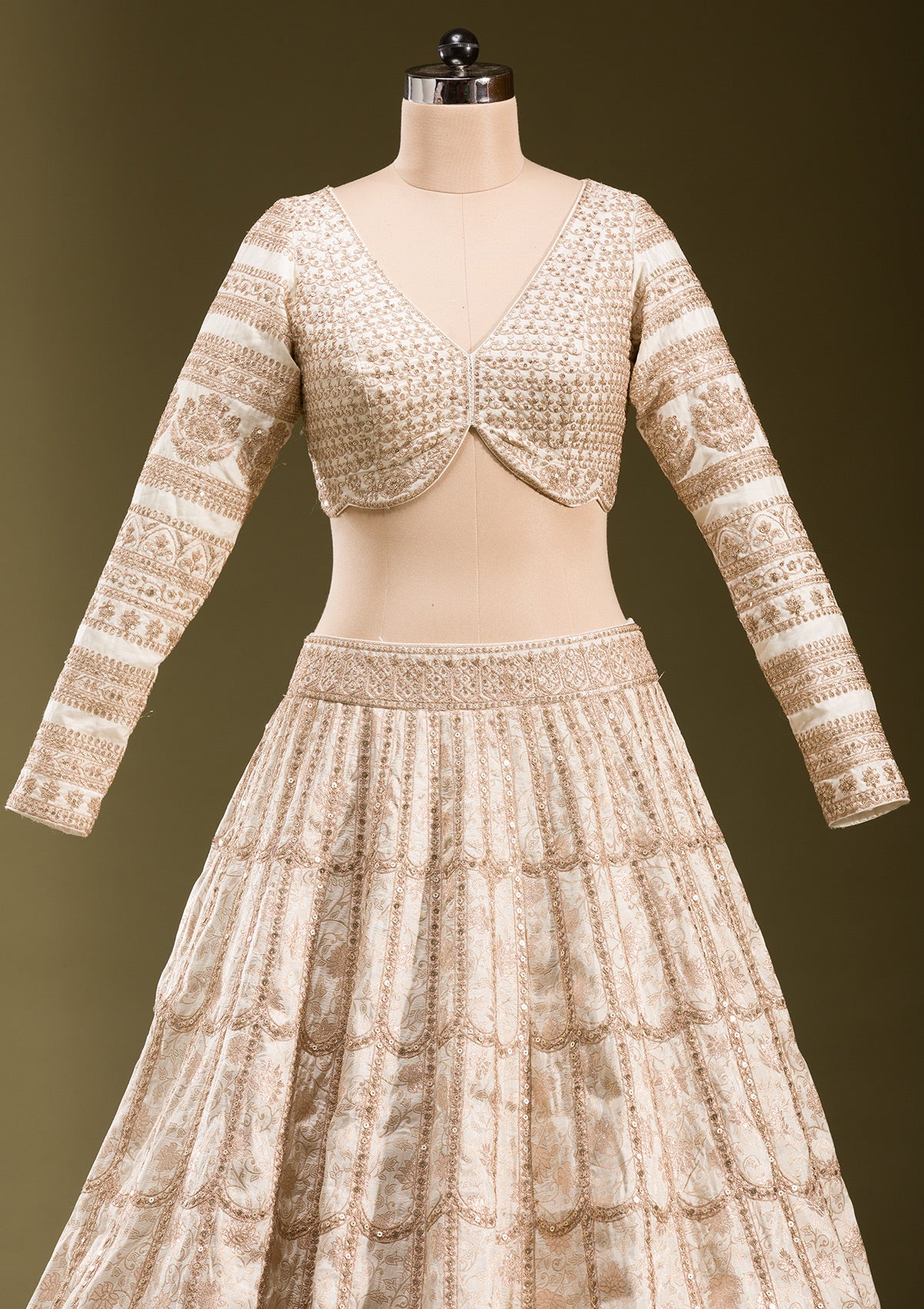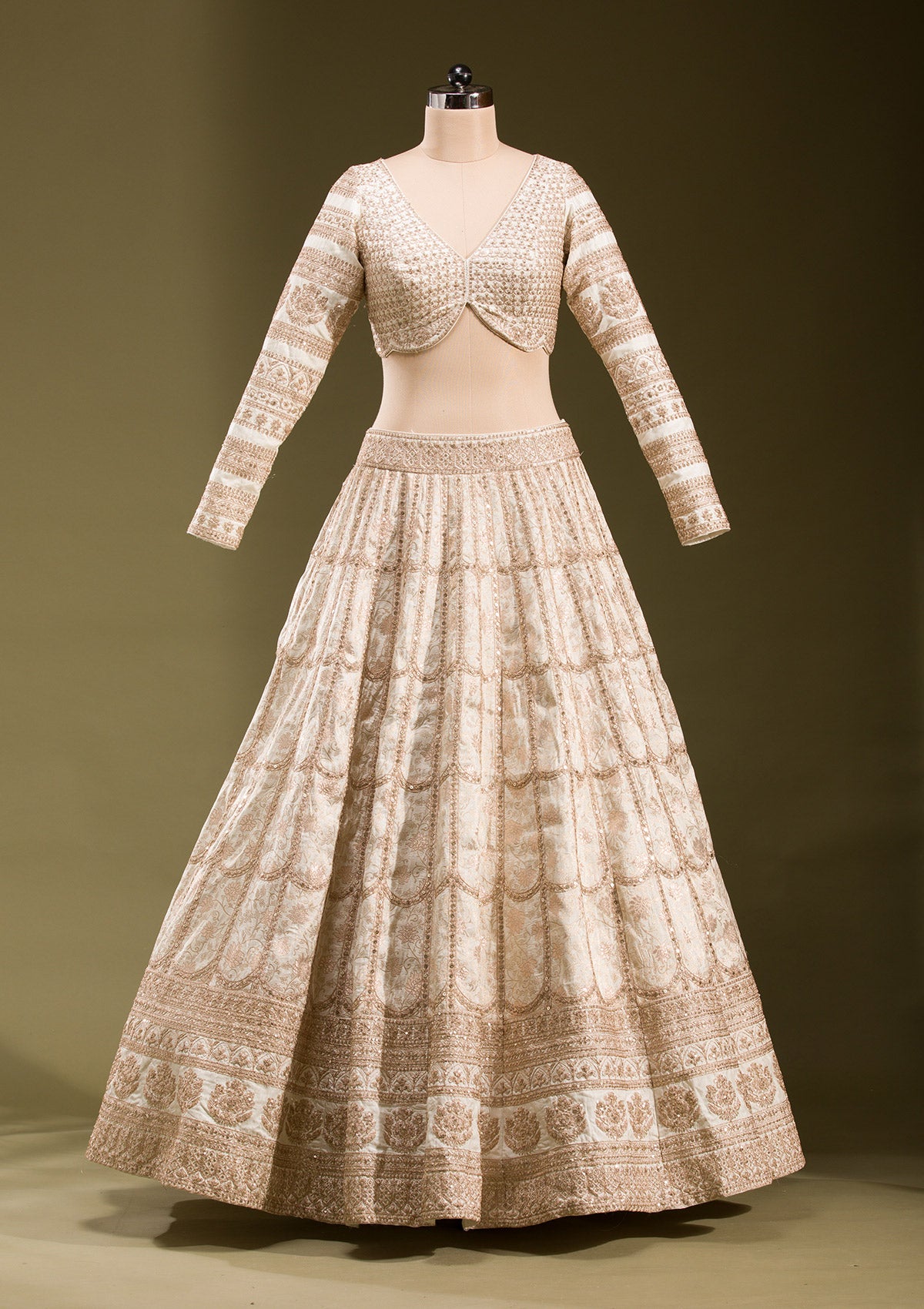 Dive into the palette of royalty with Koskii’s Banarasi Ivory Lehenga, where opulent cording embroidery meets the timeless allure of Banarasi fabric! Tailored to tickle your fancy, this majestic lehenga swirls with grace and grandeur, making it a perfect masterpiece for those who adore making dramatic, spirited entrances. Wrap yourself in the magic of Koskii, and let every swirl tell a story of elegance and vivacity.