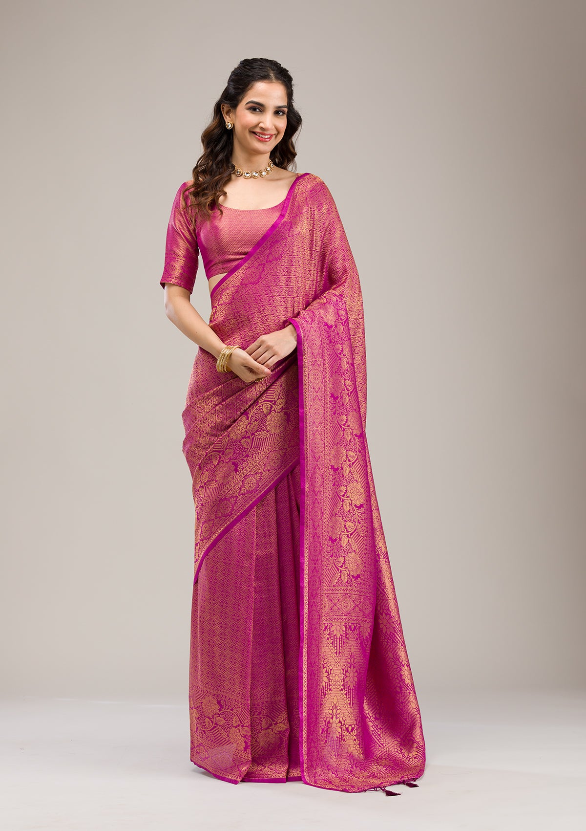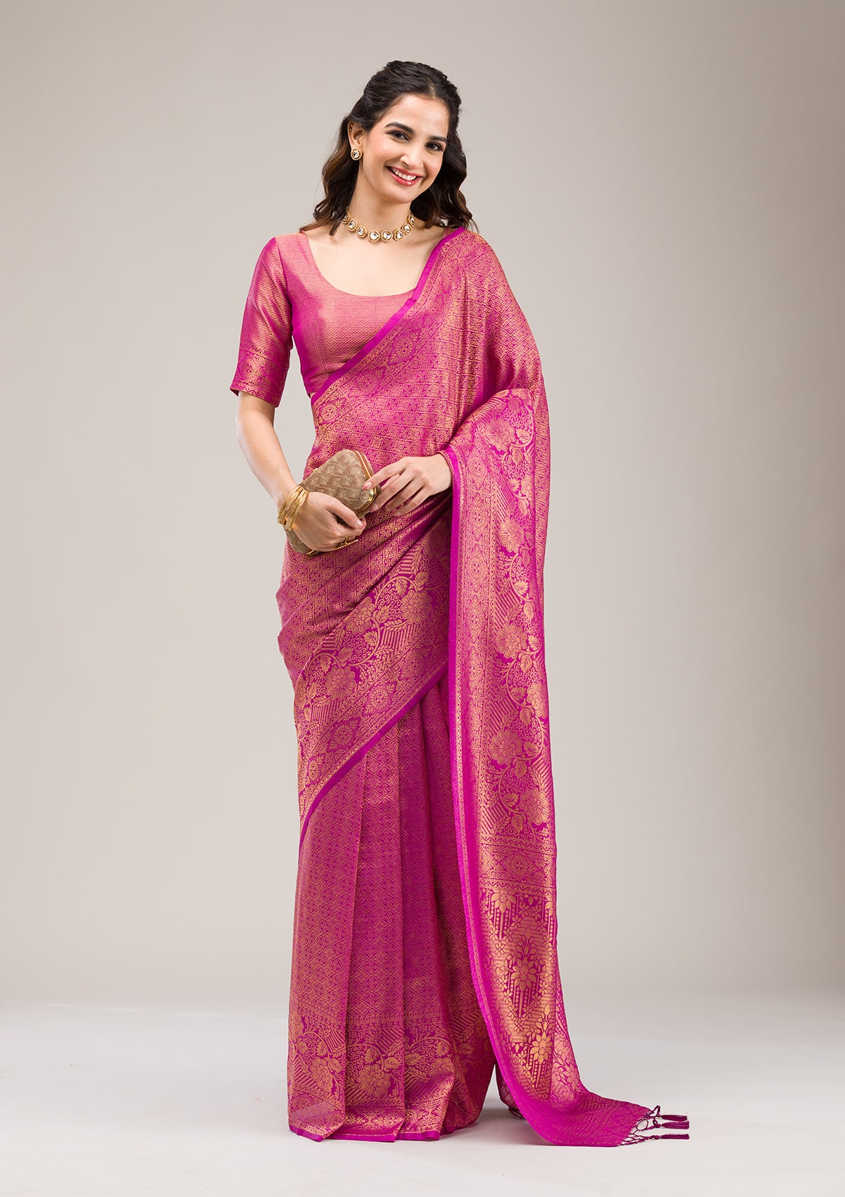 Purple Saree in Soft Silk fabric. The Saree is elevated with Zariwork embroidery. It comes with an Unstitched blouse. Comes with the Koskii promise of premium quality.