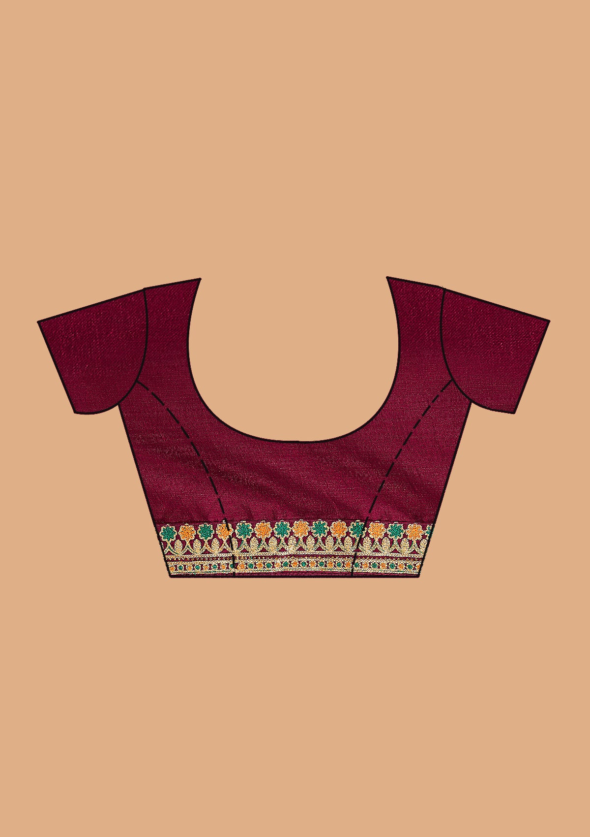 Wine Saree in Soft Raw Silk fabric. The Saree is elevated with Zariwork (Gold) embroidery. It comes with an Unstitched blouse. Comes with the Koskii promise of premium quality.
