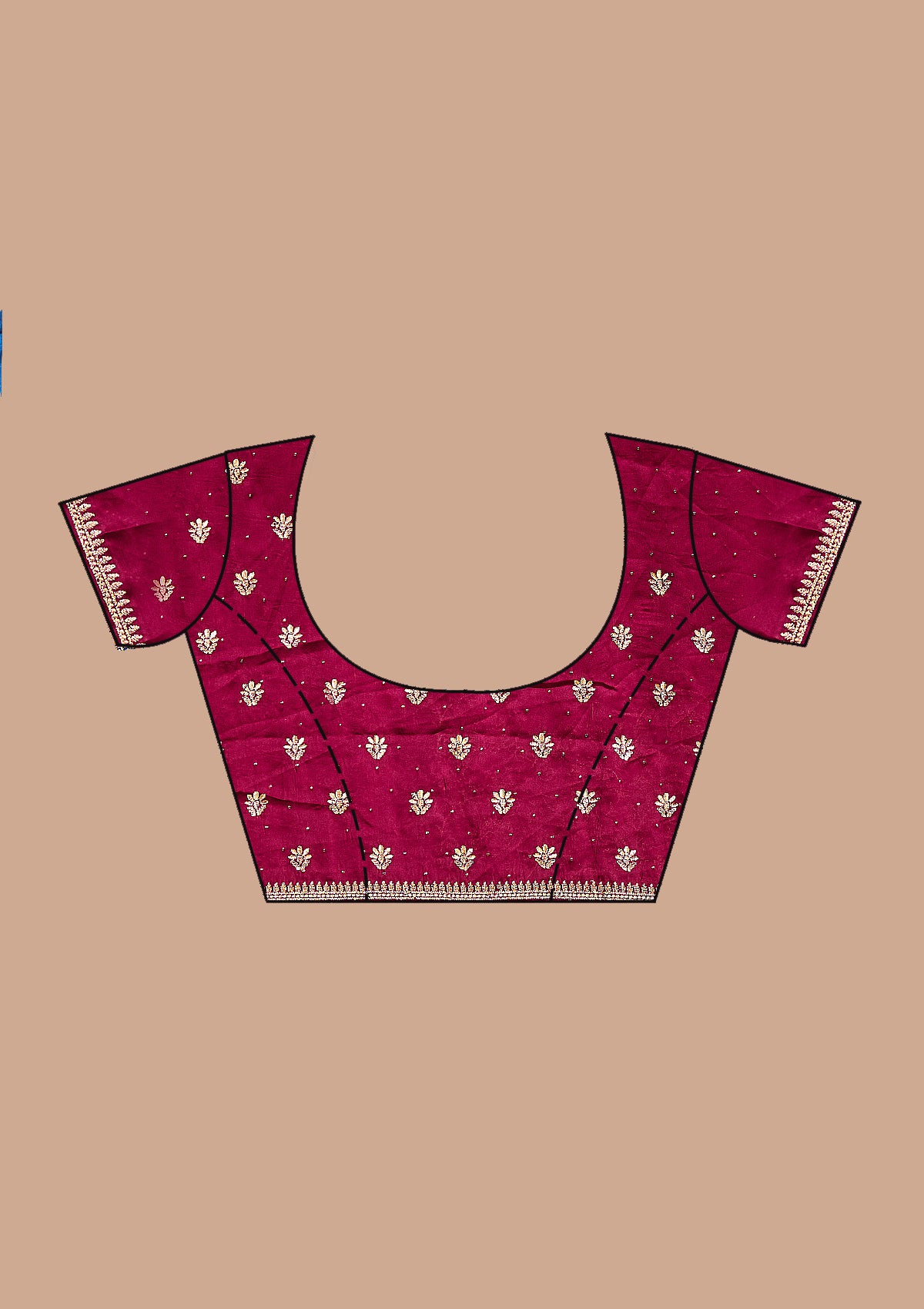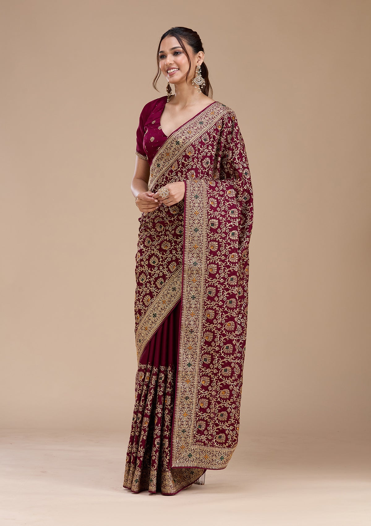 Wine Saree in Soft Raw Silk fabric. The Saree is elevated with Zariwork (Gold) embroidery. It comes with an Unstitched blouse. Comes with the Koskii promise of premium quality.