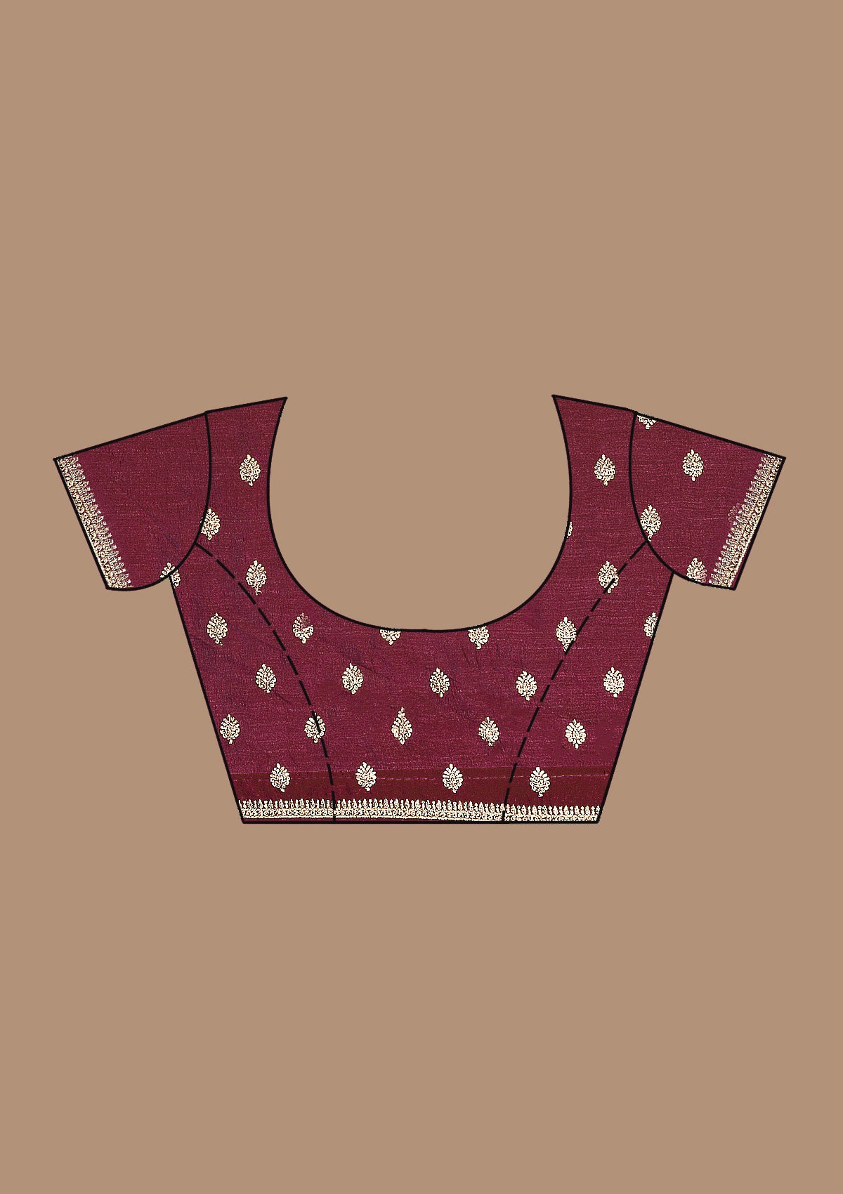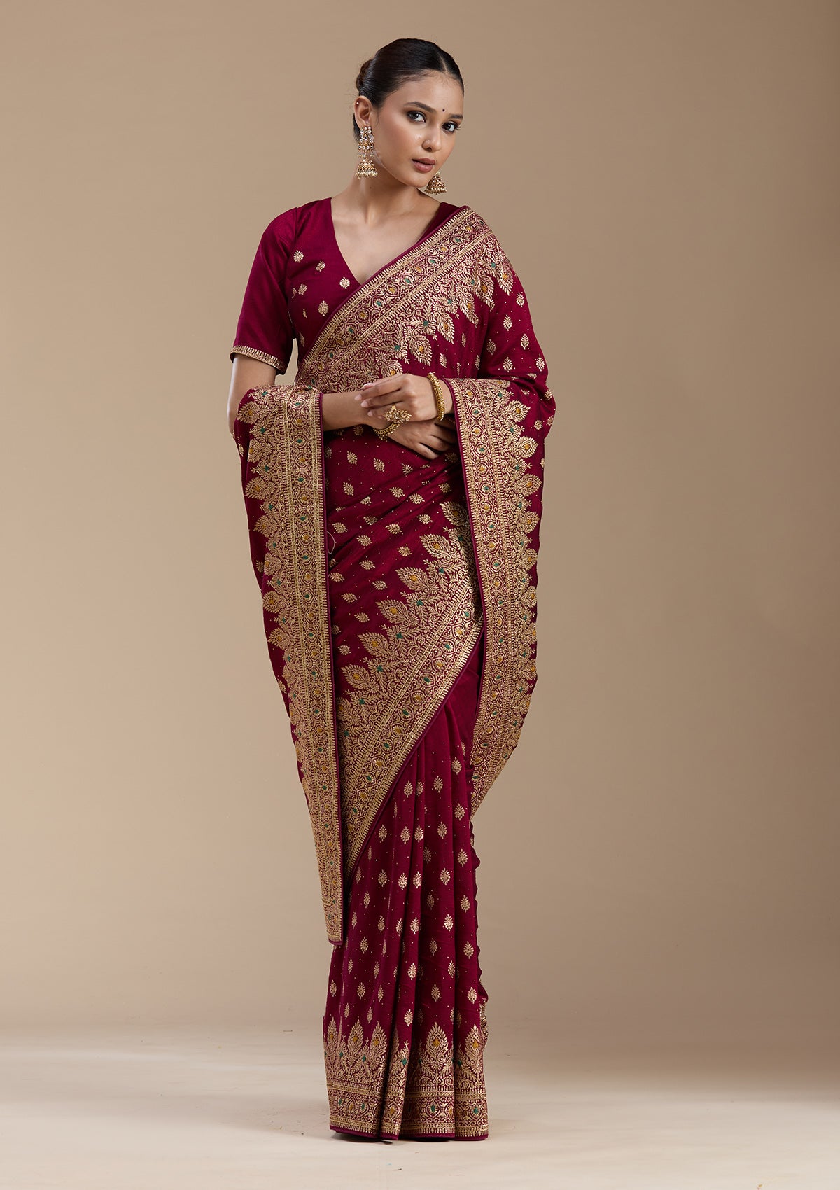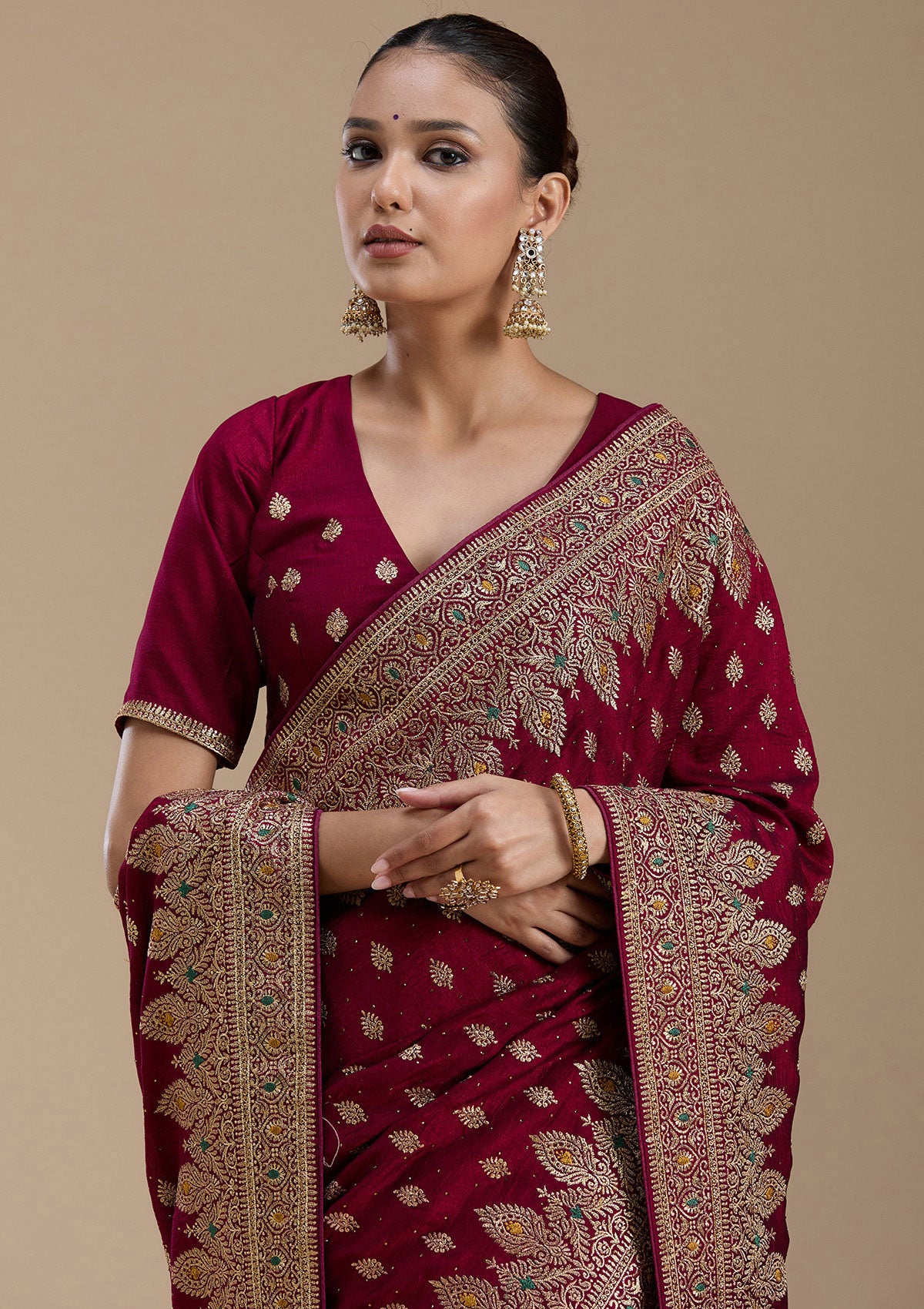 Wine Saree in Soft Raw Silk fabric. The Saree is elevated with Zariwork (Gold) embroidery. It comes with an Unstitched blouse. Comes with the Koskii promise of premium quality.