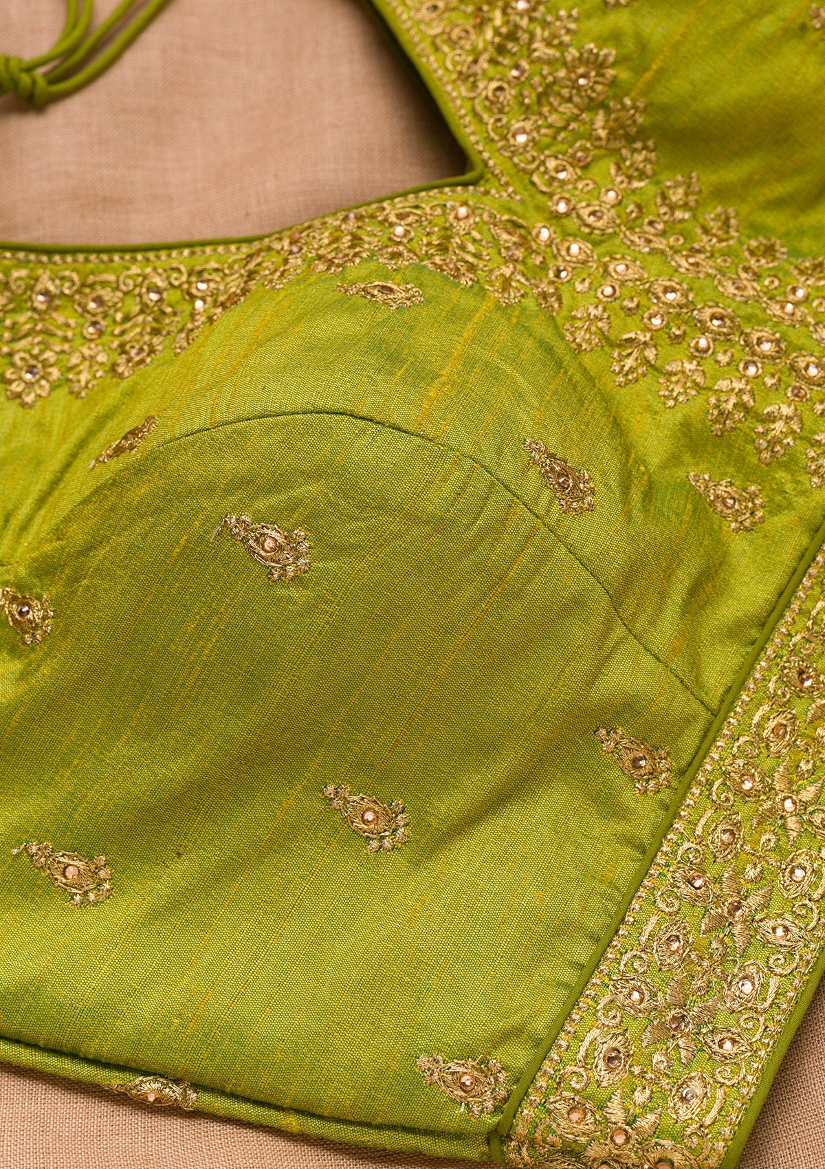 Parrot Green Ready to Wear Padded Blouse in Raw Silk fabric The Zariwork Blouse has a Deep V Neckline Comes with the Koskii promise of premium quality.