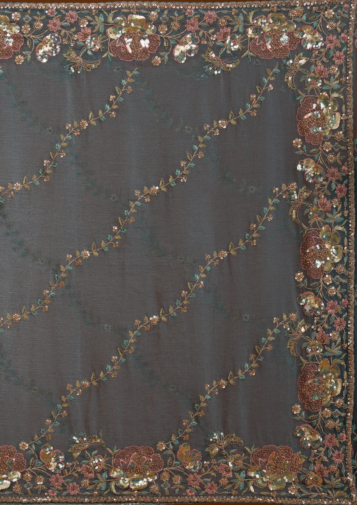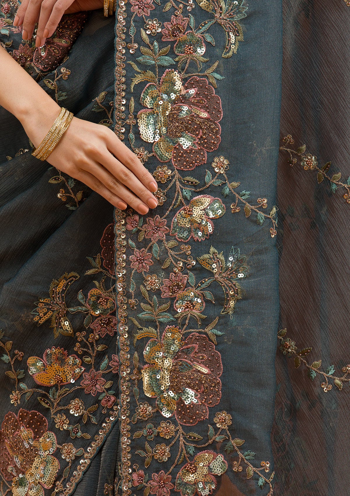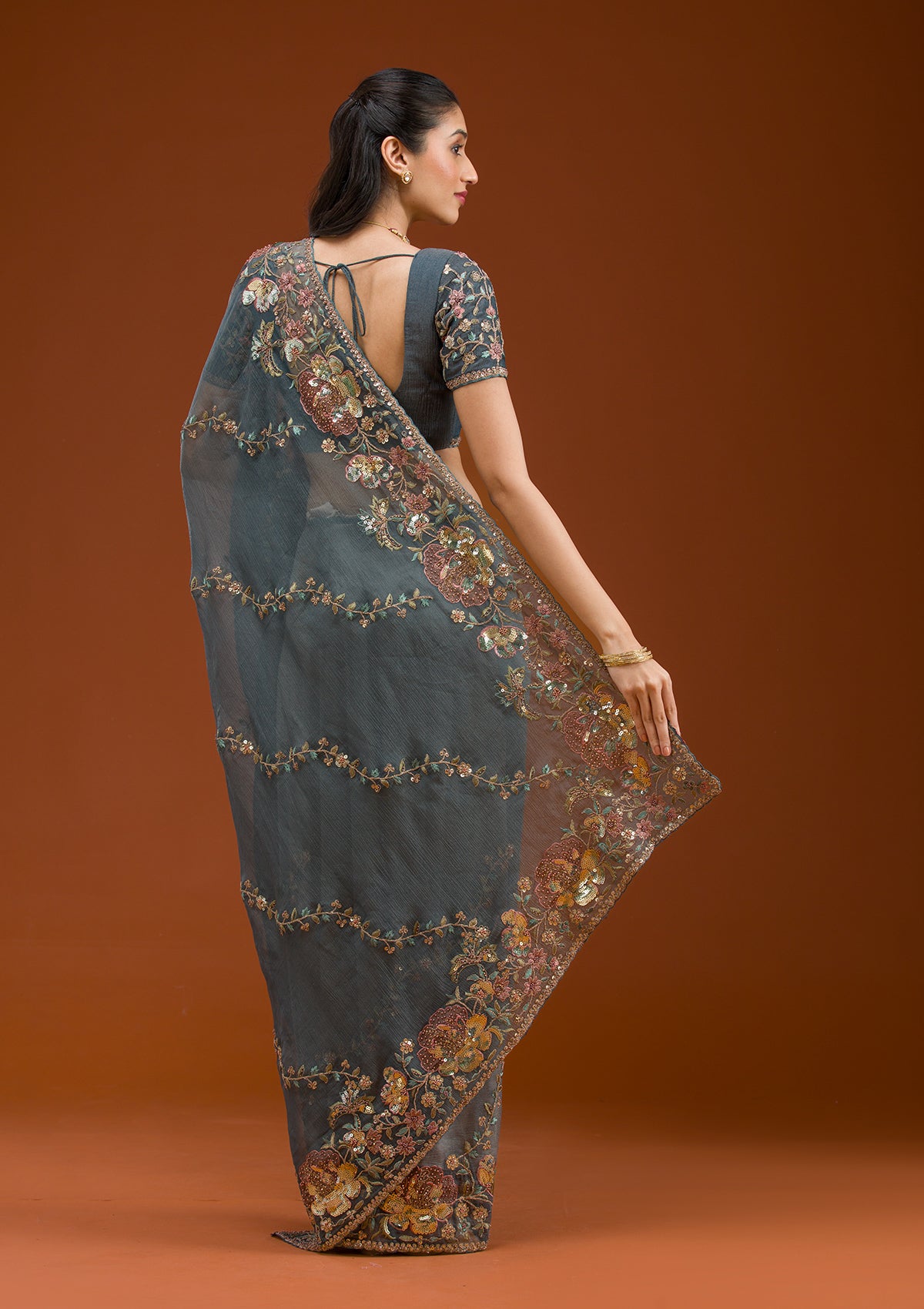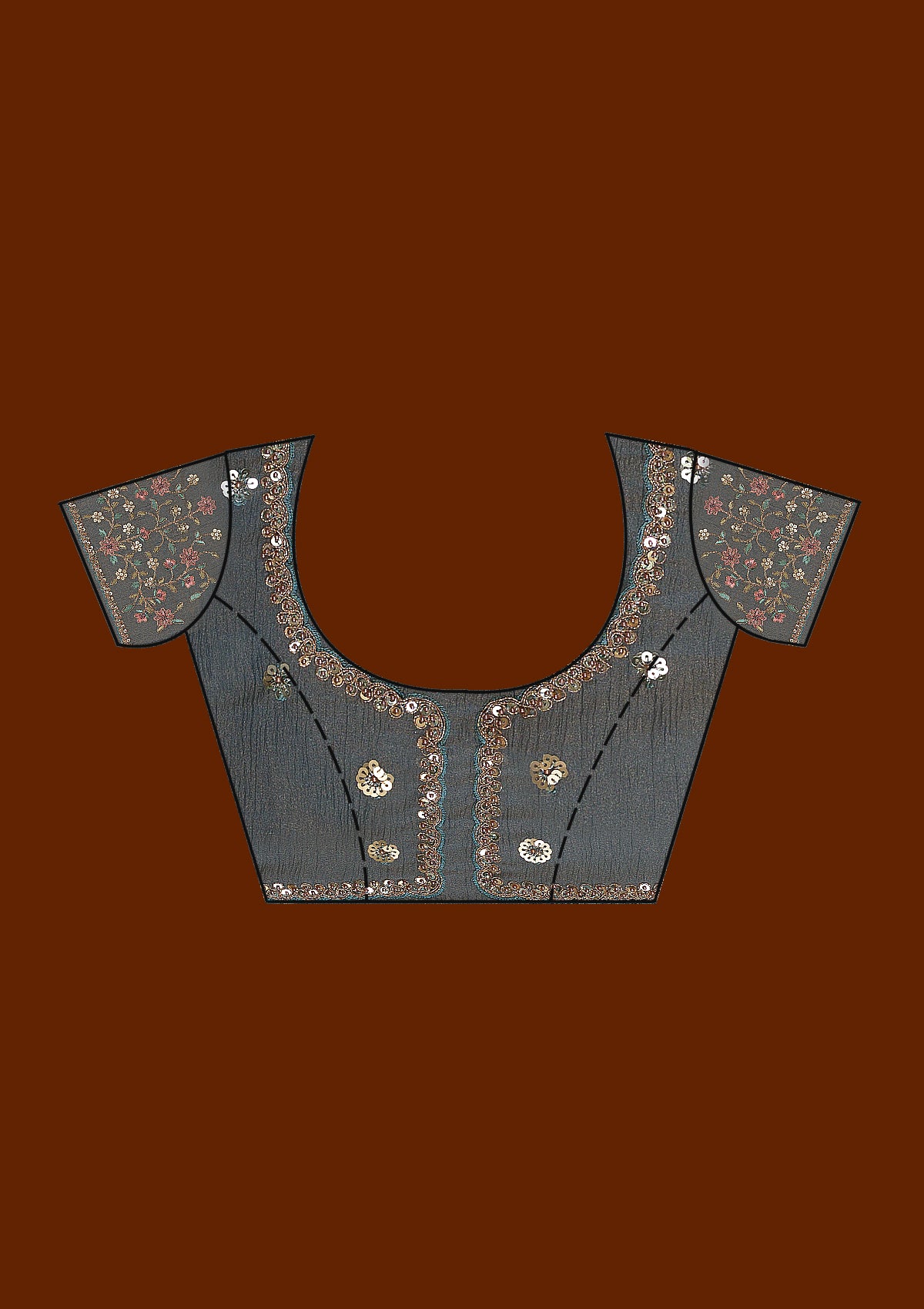 Step into the spotlight with Koskii's shimmering grey tissue saree, where every twirl is a sparkle! This stunning piece boasts vibrant sequin embroidery that catches the light and captivates the eye, perfect for those who love to express themselves with a touch of glamour. Slip into this saree and wrap yourself in the luxury of fine tissue; it's not just an outfit, it's a statement!.
