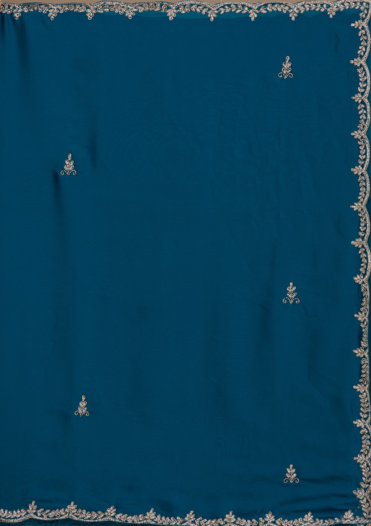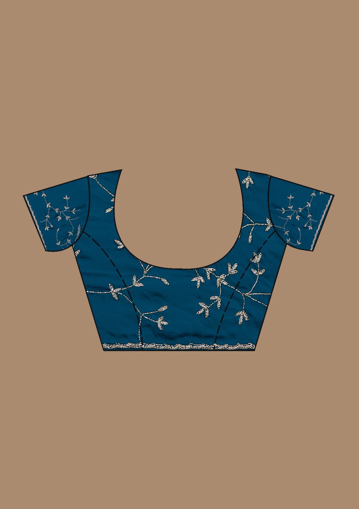 Peacock Blue Saree in Satin fabric. The Saree is elevated with Cutdana embroidery. It comes with an Unstitched blouse. Comes with the Koskii promise of premium quality.