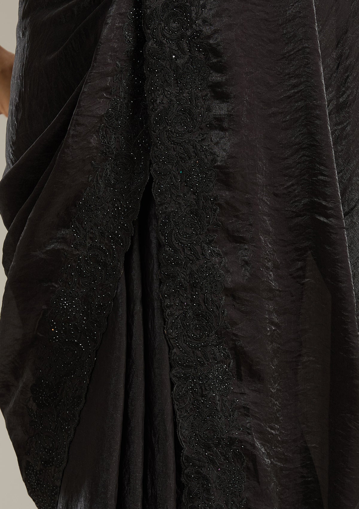 Black Saree in Tissue fabric The Saree is elevated with Threadwork embroidery It comes with an Unstitched blouse Comes with the Koskii promise of premium quality.