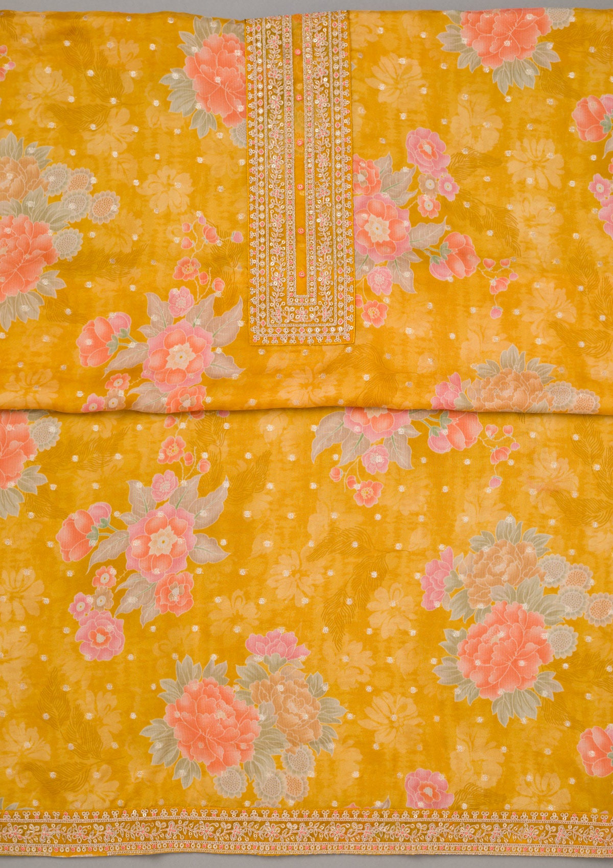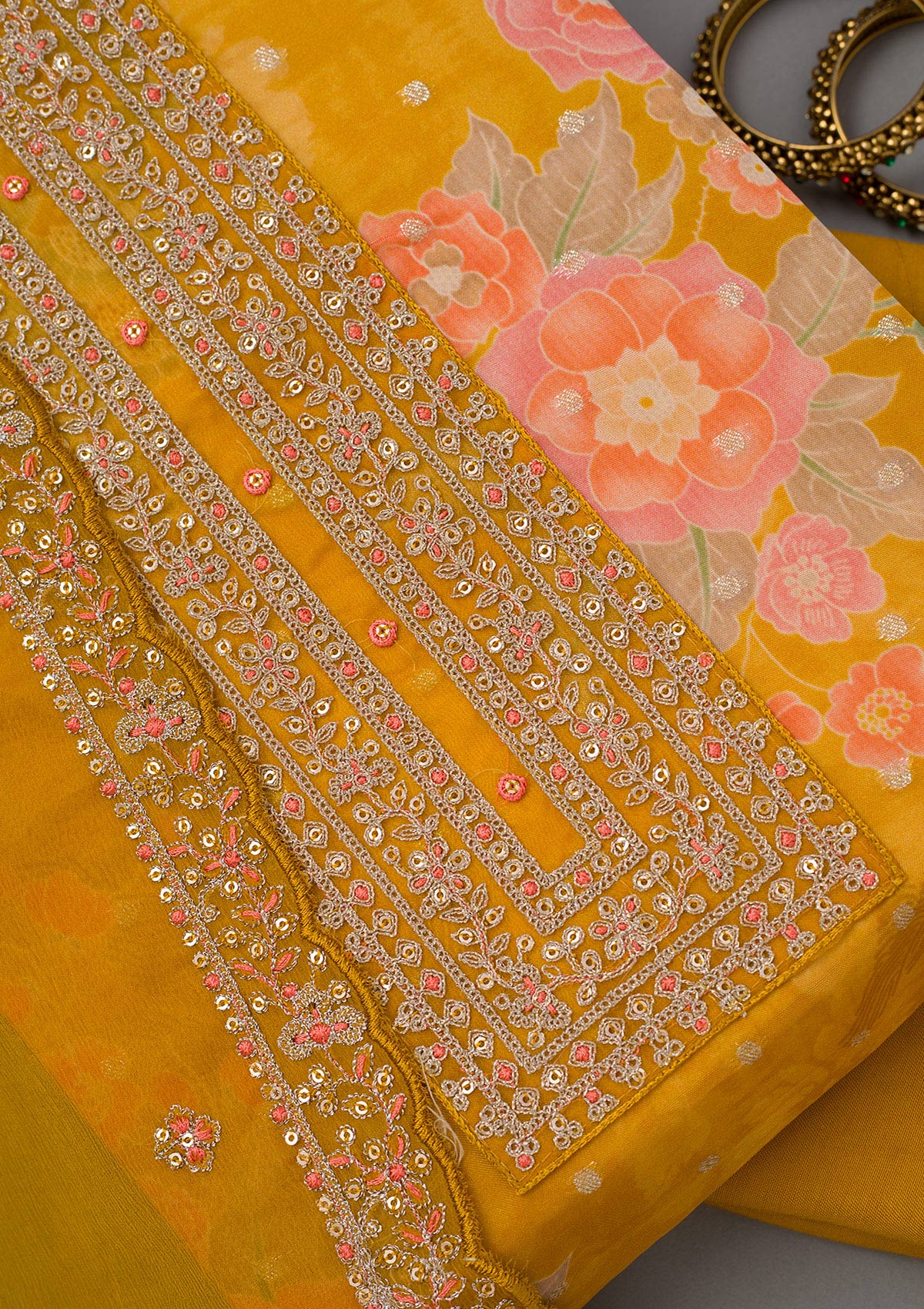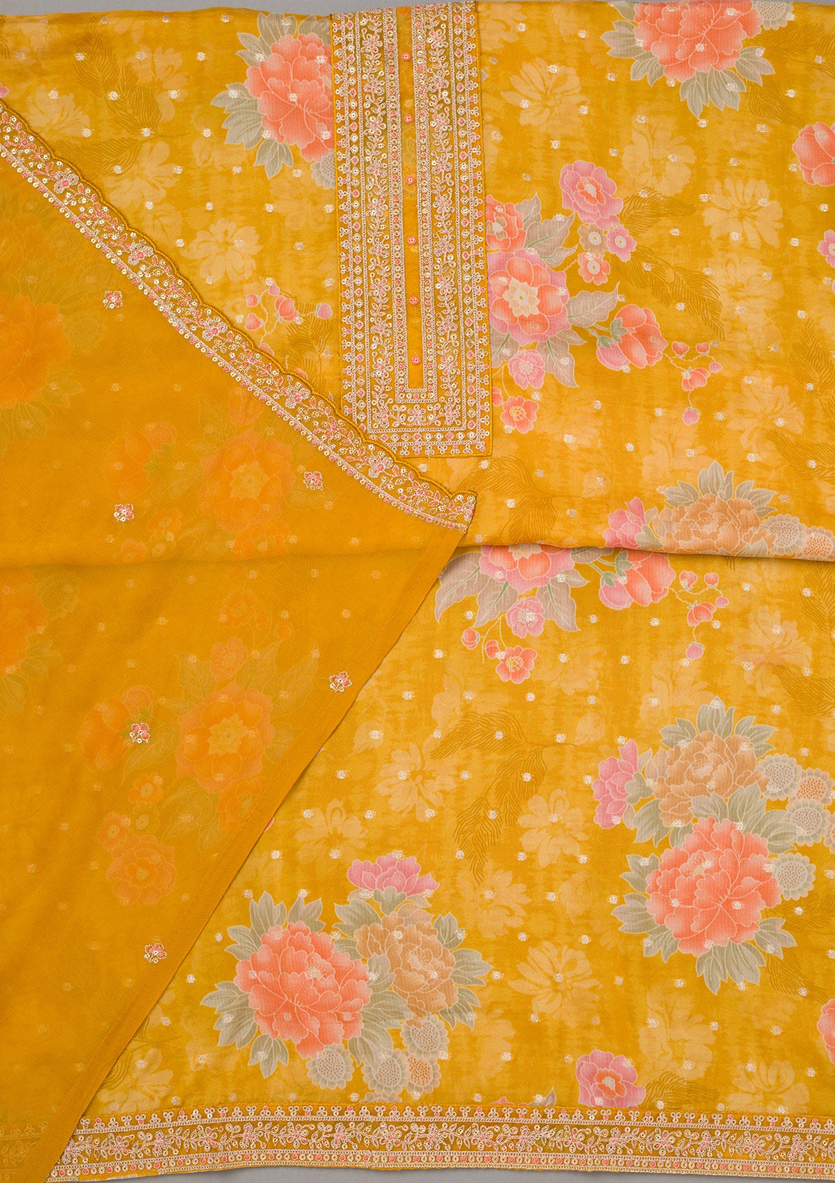 Mustard Yellow Zariwork Organza Unstitched Salwar Suit
