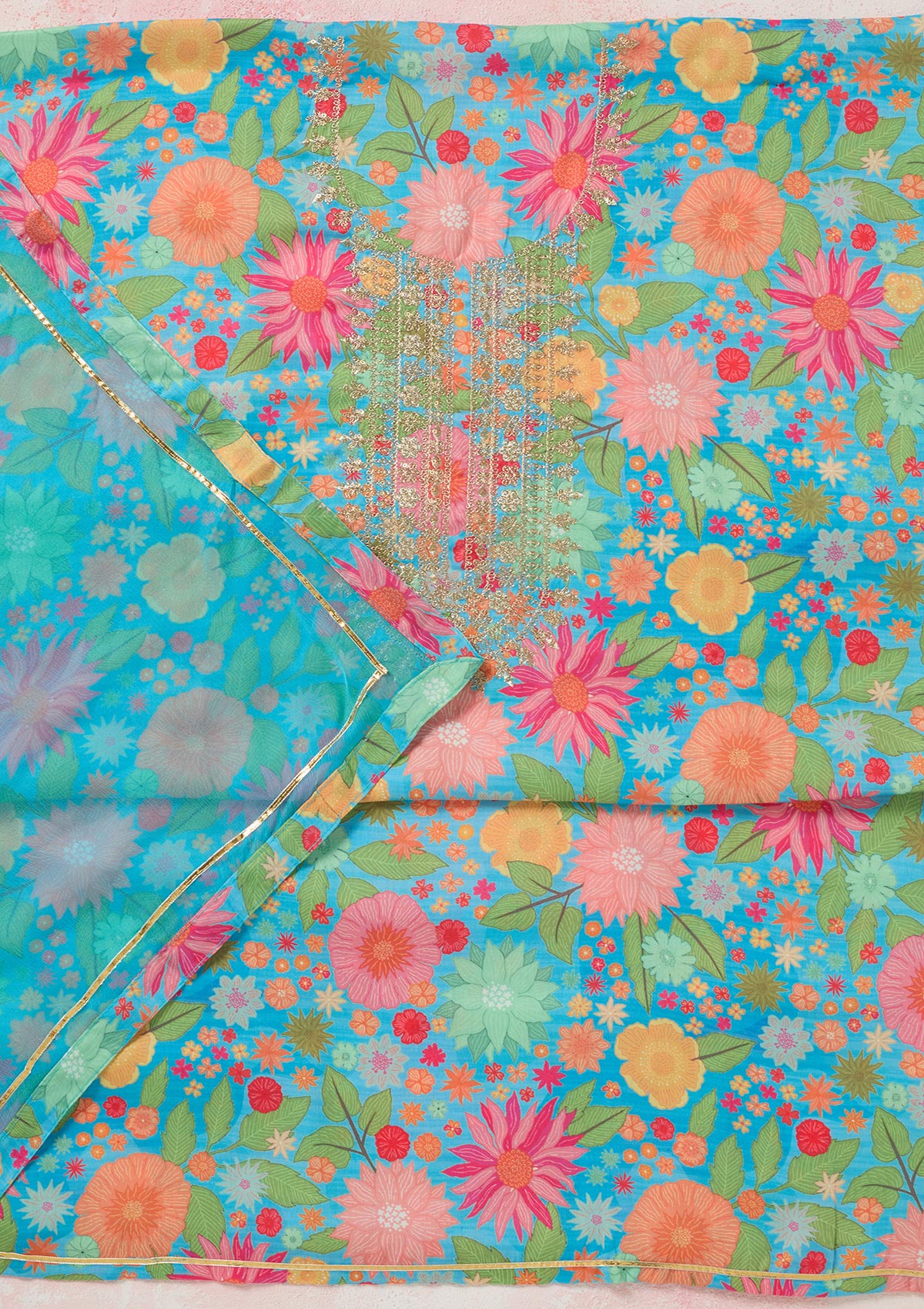 Sky Blue Zariwork (Gold) Cotton Unstitched Salwar Suit