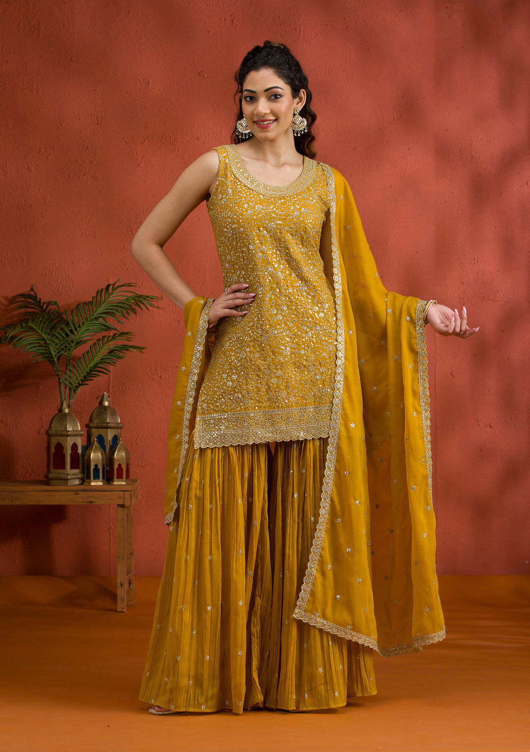 While the wedding attire is often elaborate and formal, Haldi dresses are more relaxed and playful. Opt for lightweight fabrics like cotton, chiffon, or georgette that allow easy movement and comfort during the ceremony. It’s also important to remember that turmeric paste will get on your outfit and stain it, so you might not want a very expensive one.