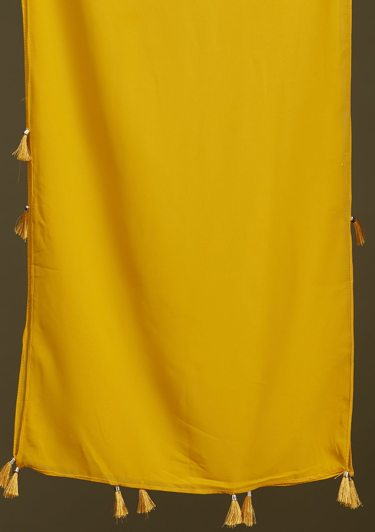 Mustard Yellow Salwar Suit in Georgette fabric. The Salwar Suit is embellished with Threadwork embroidery. Accompanied with a bottom and dupatta. Comes with the Koskii promise of premium quality.