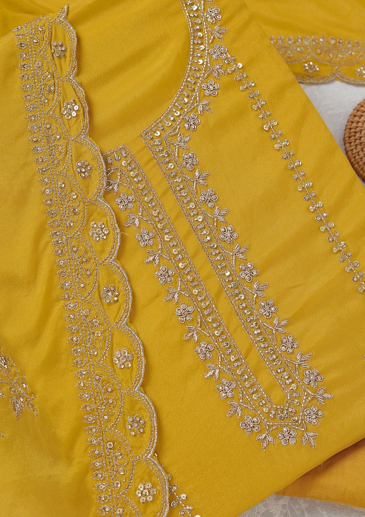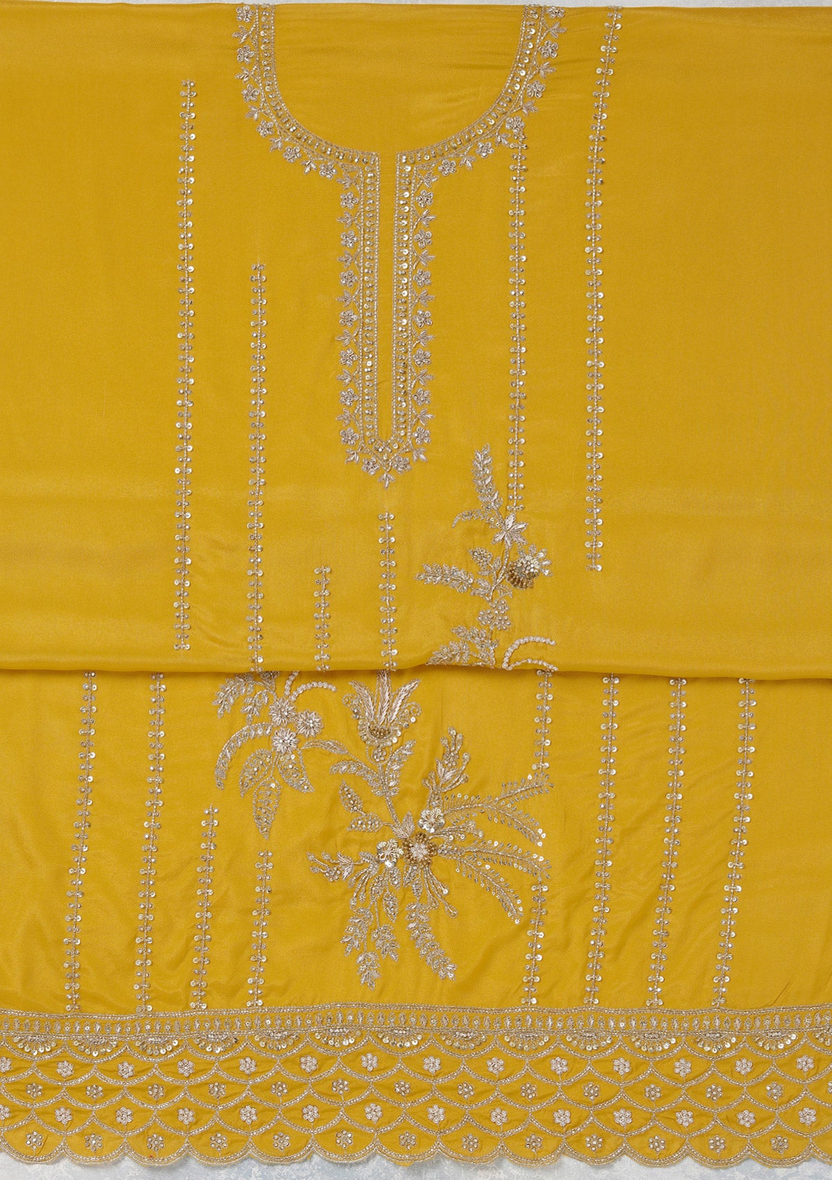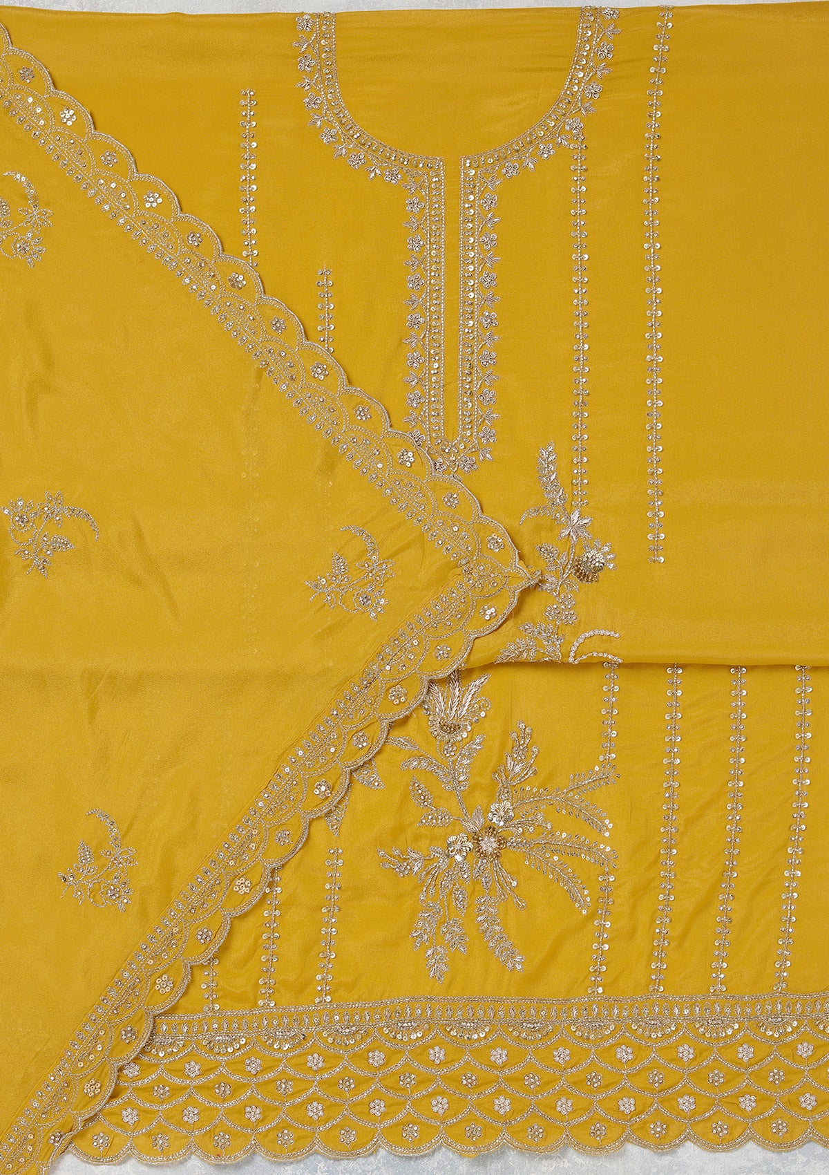 Mustard Salwar Suit in Georgette fabric. The Salwar Suit is embellished with Zariwork (Gold) embroidery. Accompanied with a bottom and dupatta. Comes with the Koskii promise of premium quality.