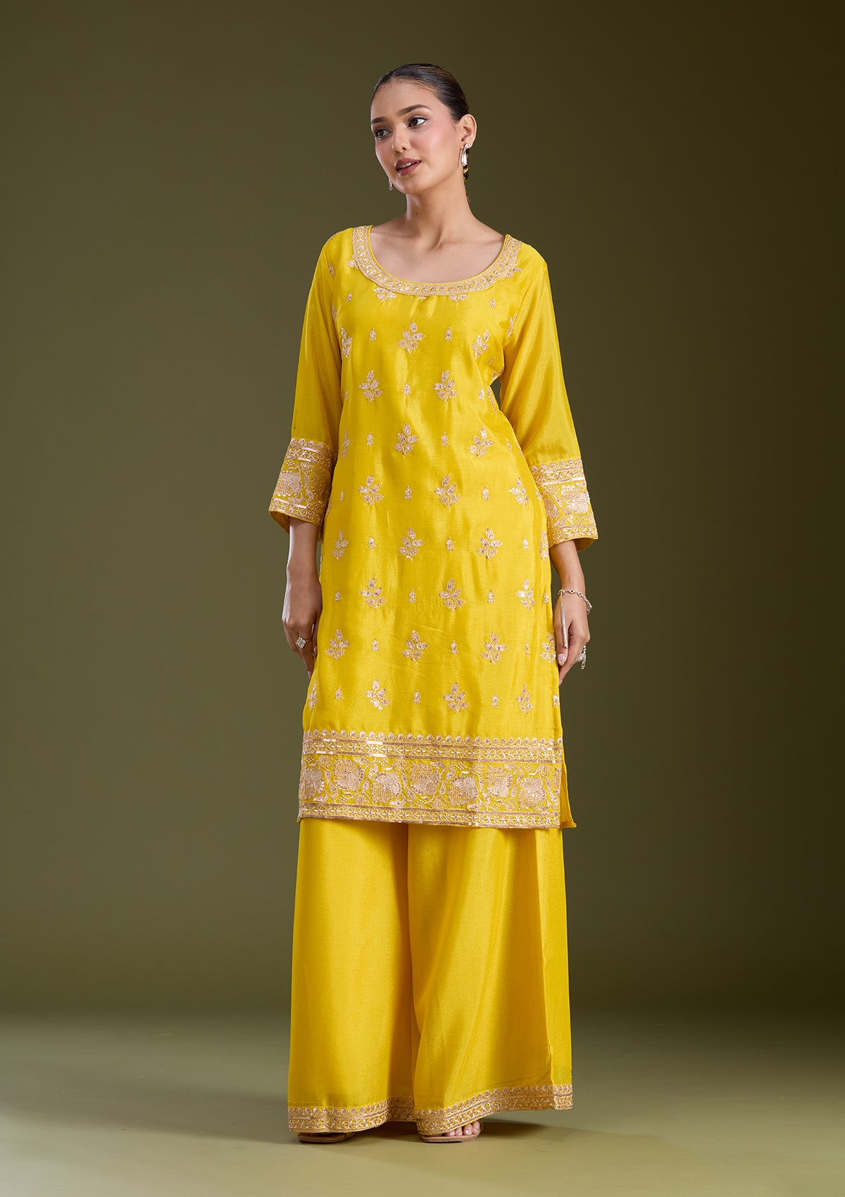 Yellow Sequins Soft Raw Silk Readymade Salwar Suit