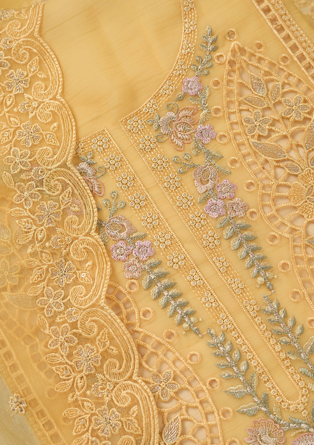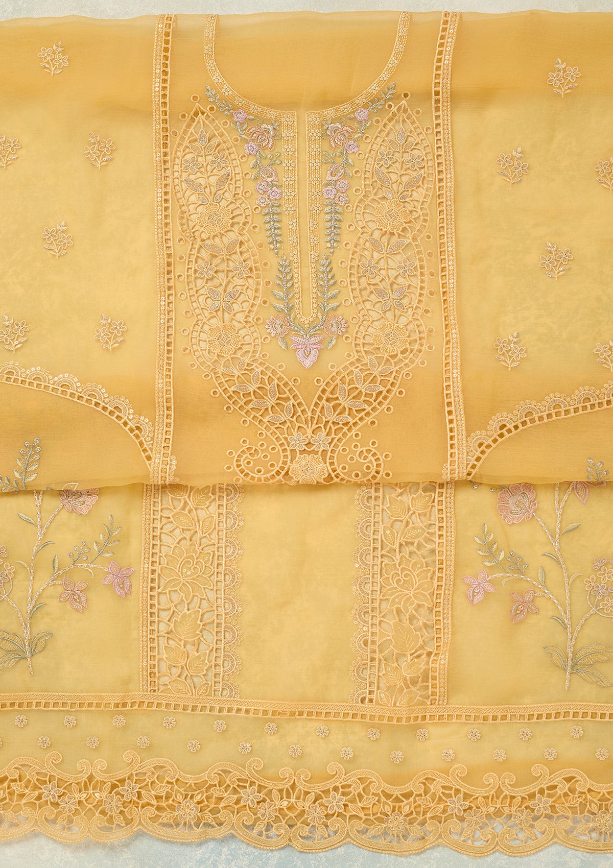 Yellow Threadwork Tissue Unstitched Salwar Suit