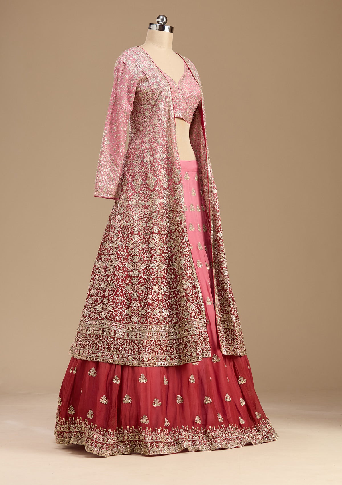 Pink Readymade Lehenga in Georgette fabric. The Lehenga is embellished with Zardozi (Gold) embroidery. Accompanied with an Readymade blouse and dupatta. Comes with the Koskii promise of premium quality.