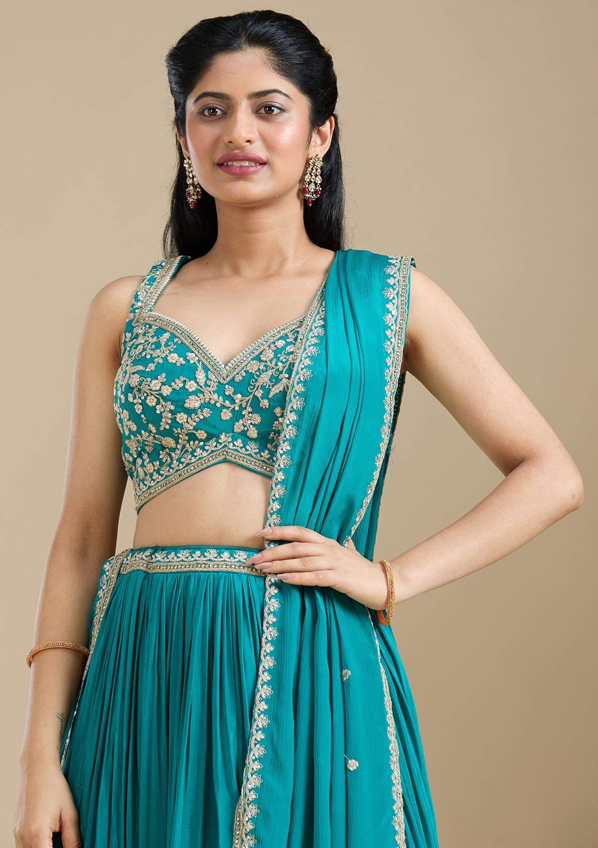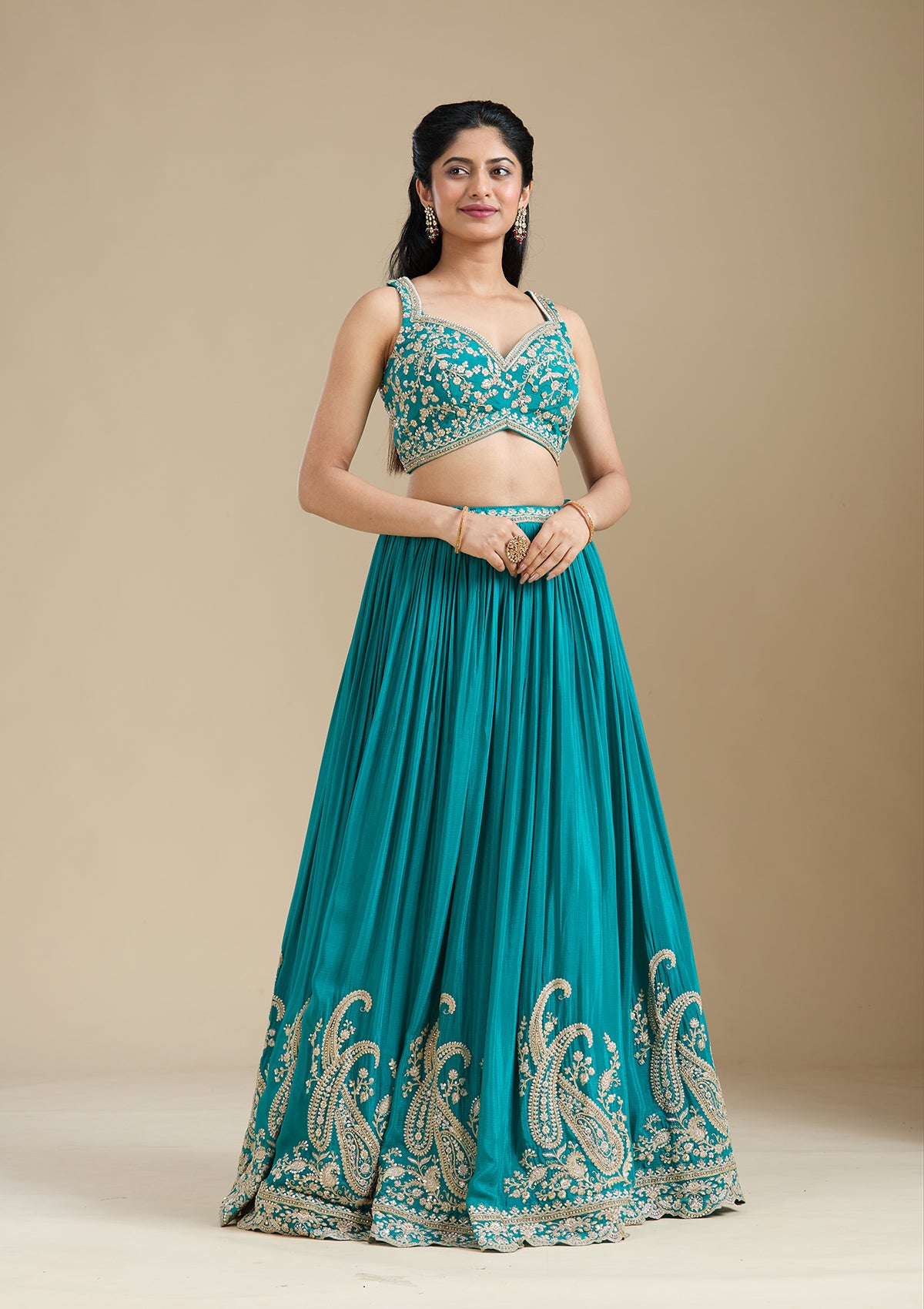 Turquoise Blue Readymade Lehenga in Crepe fabric The Lehenga is embellished with Zariwork (Gold) embroidery Accompanied with an Readymade blouse and dupatta Comes with the Koskii promise of premium quality.