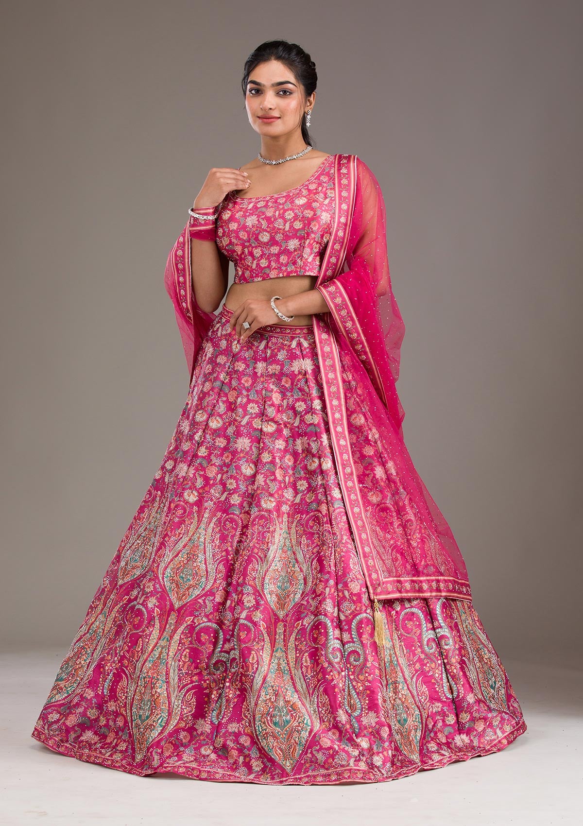 Step into a world of enchantment with Koskii's Banarasi Pink Lehenga, where vibrant hues meet the intricate grandeur of silver zariwork. Crafted from the finest Banarasi fabric, this lehenga swirls with every step, showcasing exquisite artistry that captivates and charms. Perfect for those who celebrate life with passion and style, it invites you to twirl into your next celebration with confidence and flair!.