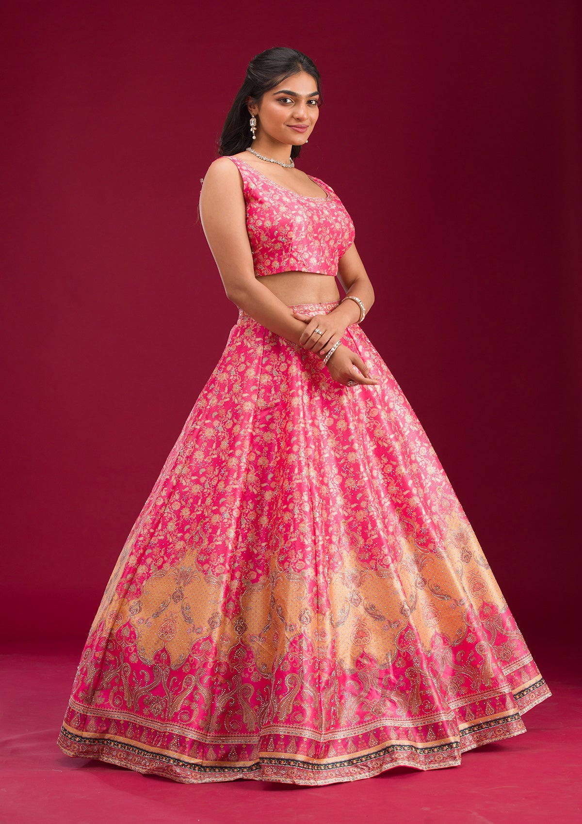 Twirl and dazzle at any grand affair in this Koskii Raw Silk Magenta Lehenga, exquisitely embroidered with genuine Swarovski crystals that capture every shimmer of light. Designed to epitomize luxury, this lehenga promises not just comfort but also a spectacular display of vibrant magenta hues and intricate craftsmanship. Perfect for the bride who loves to blend tradition with a touch of modern opulence!.