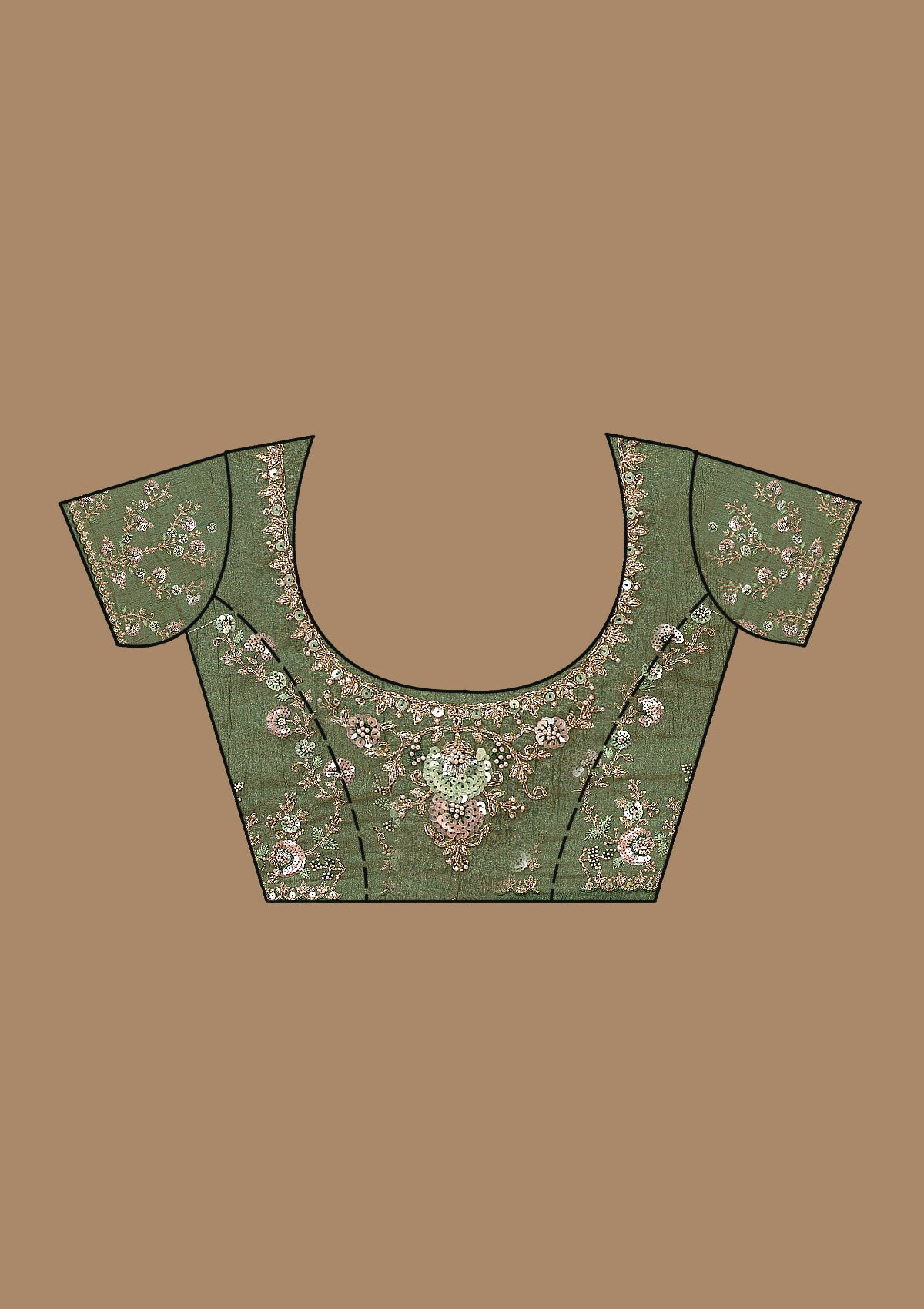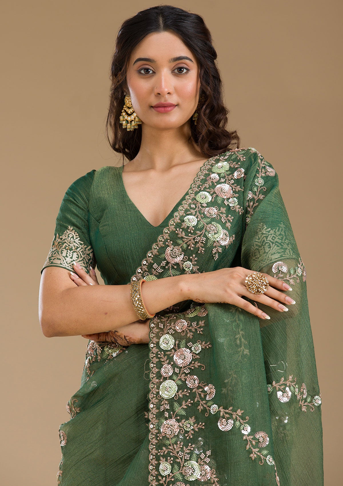 Bottle Green Saree in Tissue fabric. The Saree is elevated with Sequins embroidery. It comes with an Unstitched blouse. Comes with the Koskii promise of premium quality.