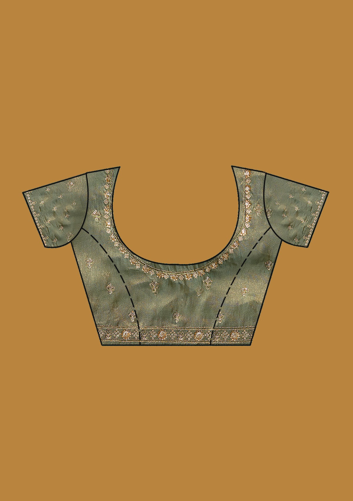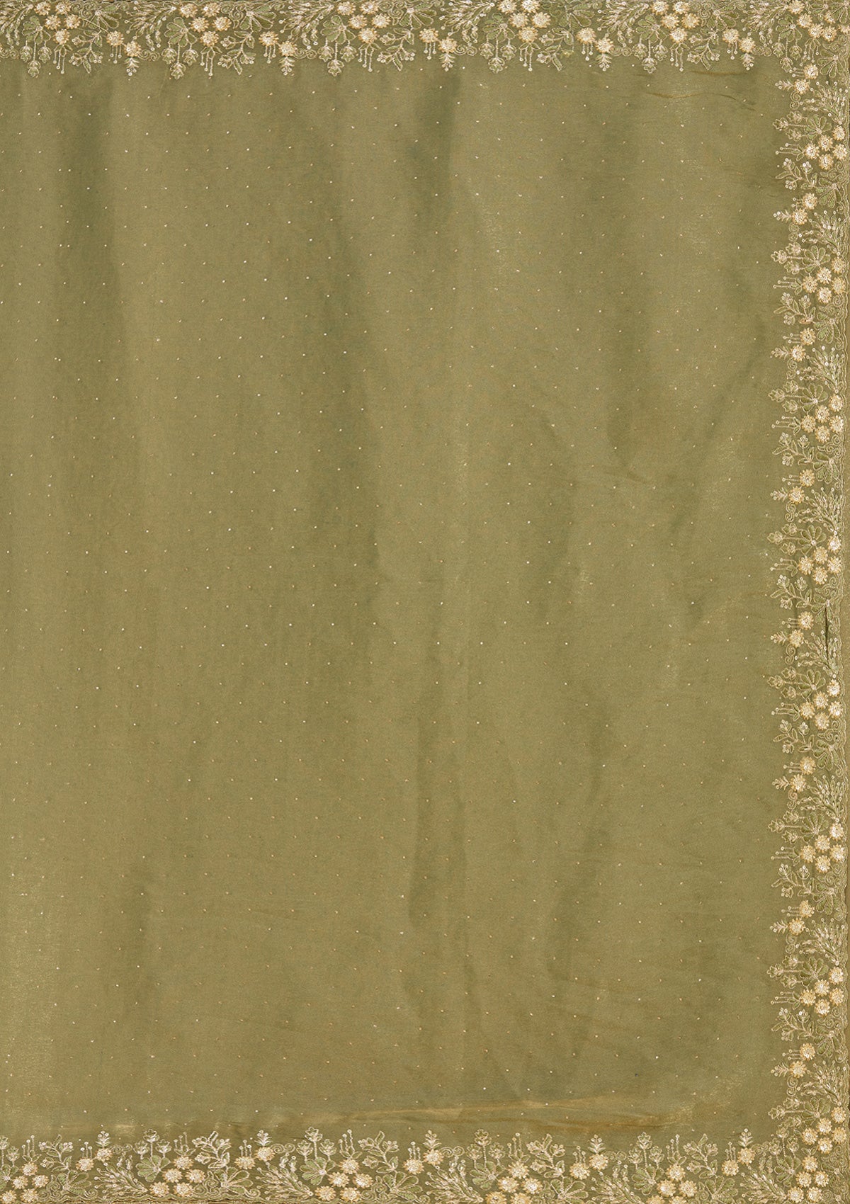Mehandi Green Saree in Tissue fabric. The Saree is elevated with Zariwork (Gold) embroidery. It comes with an Unstitched blouse. Comes with the Koskii promise of premium quality.