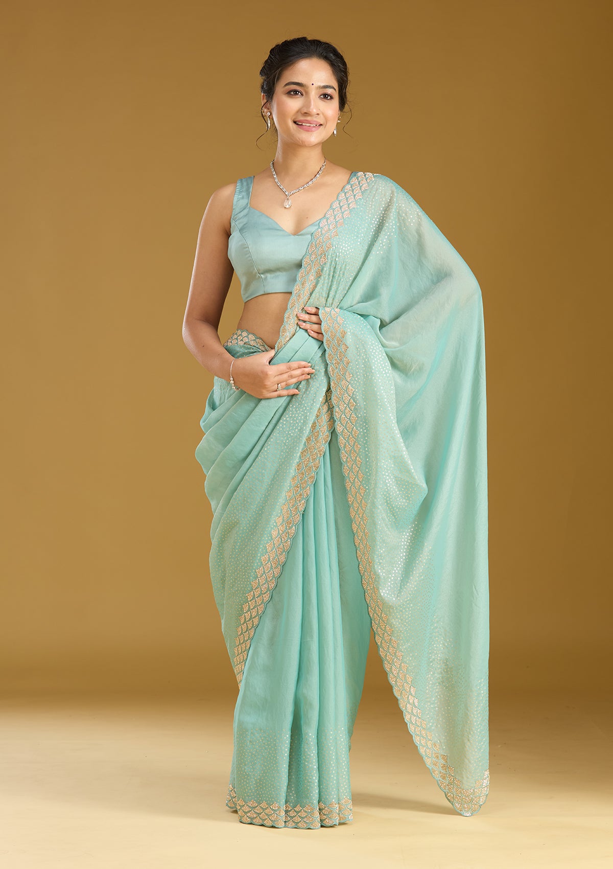 Sea Green Saree in Tissue fabric. The Saree is elevated with Sequins embroidery. It comes with an Unstitched blouse. Comes with the Koskii promise of premium quality.