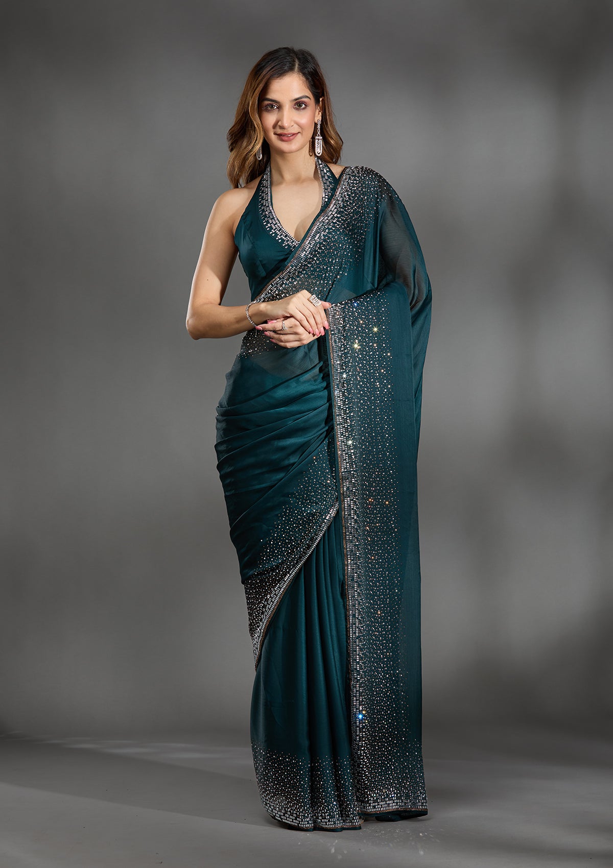 Teal Green Saree in Chiffon fabric The Saree is elevated with Stonework embroidery It comes with an Unstitched blouse Comes with the Koskii promise of premium quality.