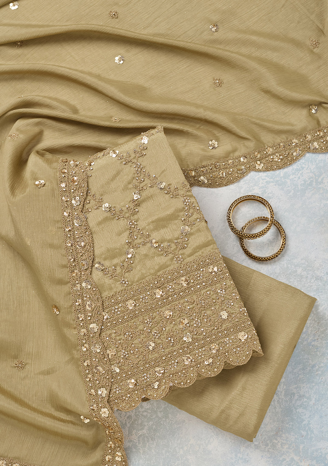 | Rama Green Zariwork (Gold) Semi Crepe Unstitched Salwar Suit | ₹ 6,993 | |