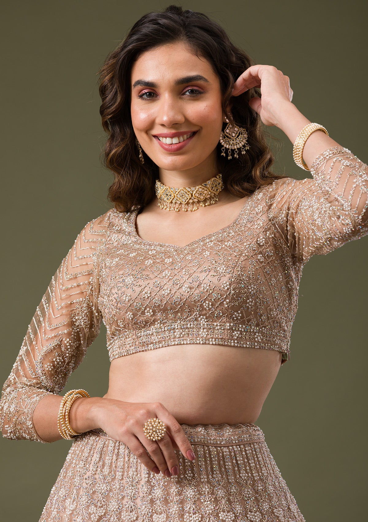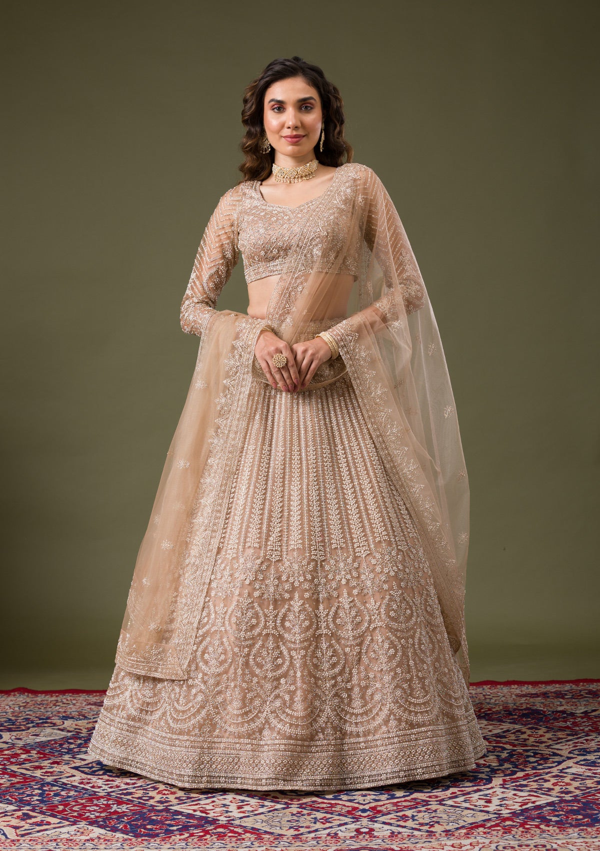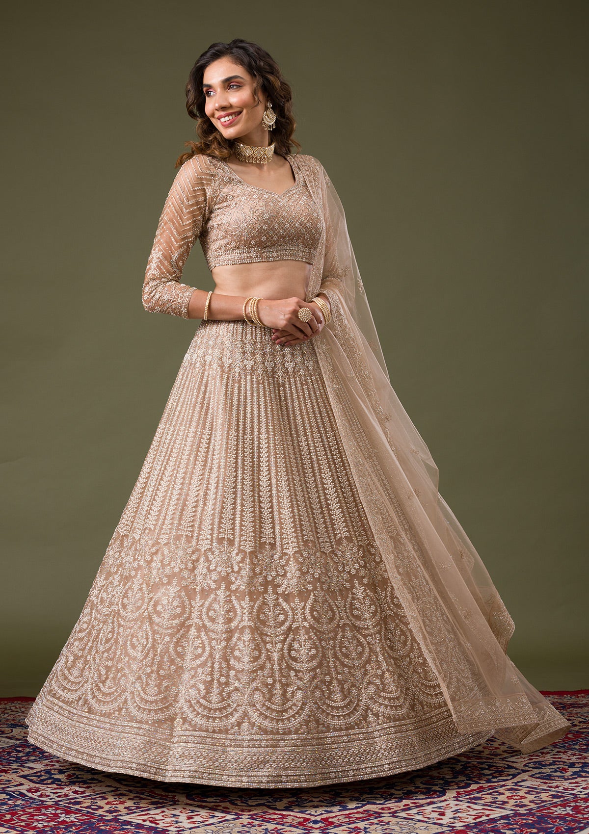 Discover the dazzling world of Koskii with this exquisite beige Net Lehenga, embellished with luxurious silver stonework that captures every flicker of light. Crafted with an eye for the vibrant and spirited, this lehenga boasts a playful elegance, perfect for those who dress to impress and celebrate with flair. Let each twirl unveil its story, as the fine net fabric flows effortlessly, making it a masterpiece of both comfort and style.