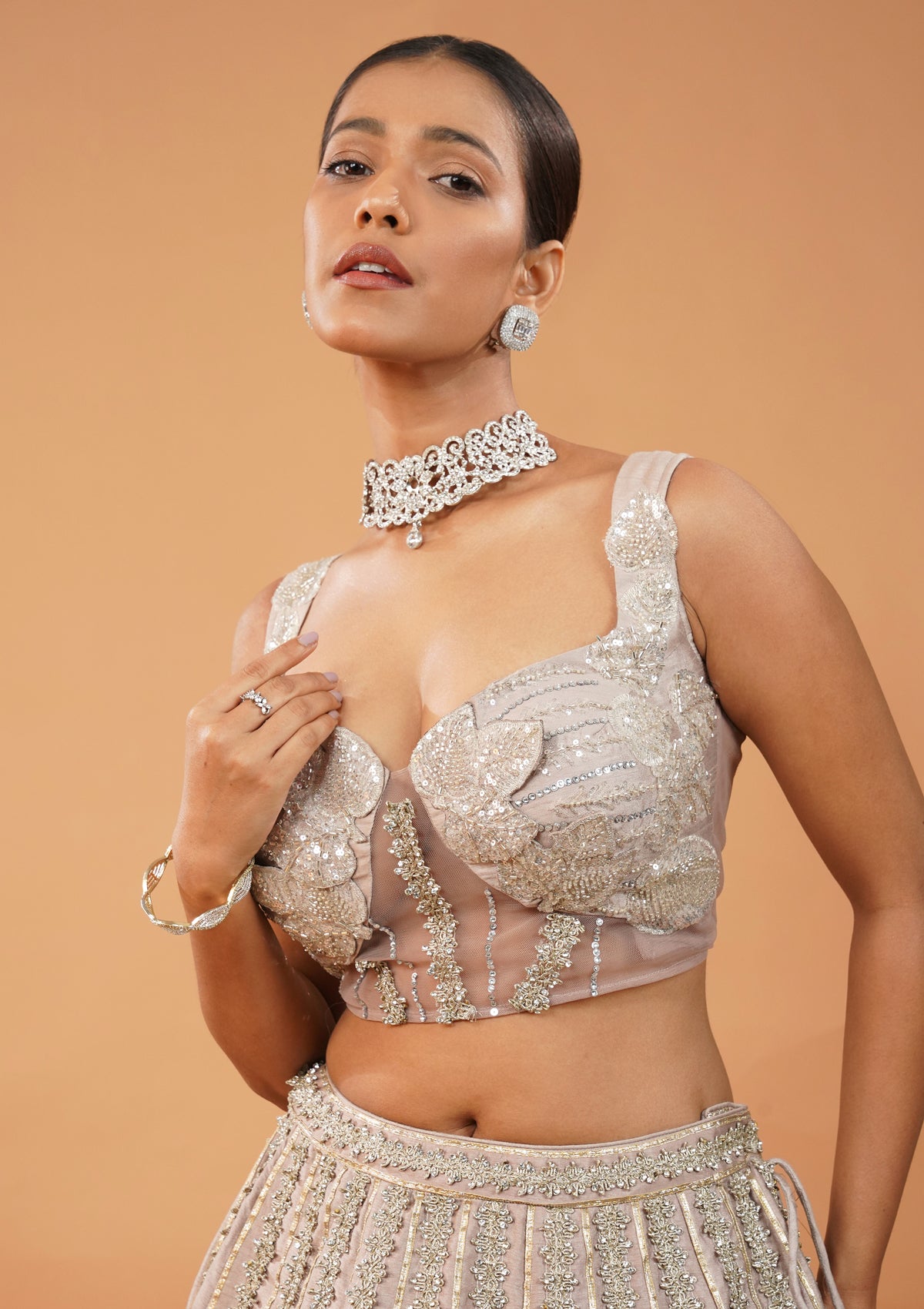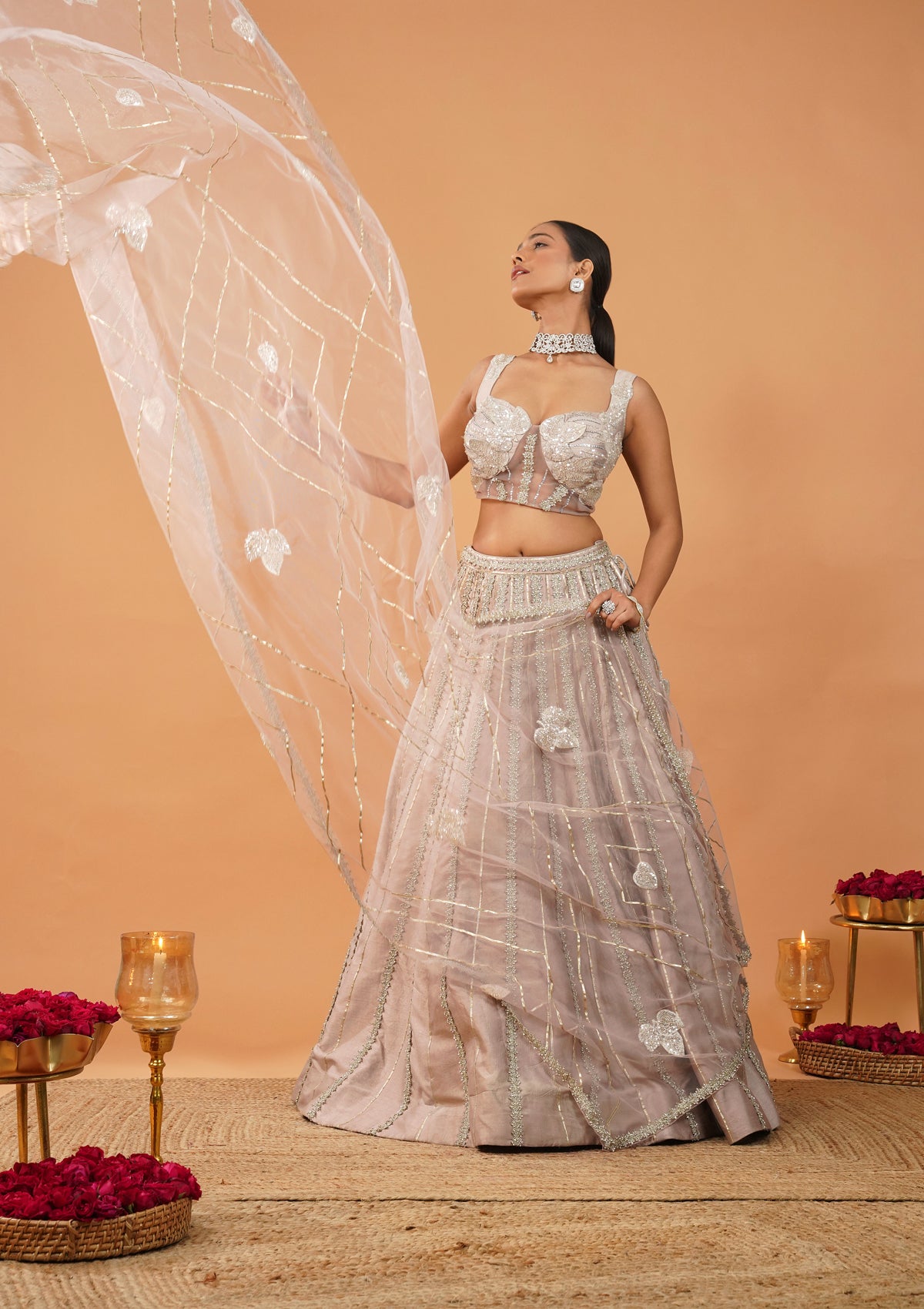 Twirl into the spotlight with Koskii's captivating silver lehenga, artfully crafted in luxurious raw silk and meticulously adorned with radiant stonework. This ensemble epitomizes grace and glamour in every fold, designed to make you the belle of any ball. With its vibrant energy and plush fabric, this lehenga invites you to express your joyful spirit and unmatchable style at elegant gatherings or any festive occasion!.