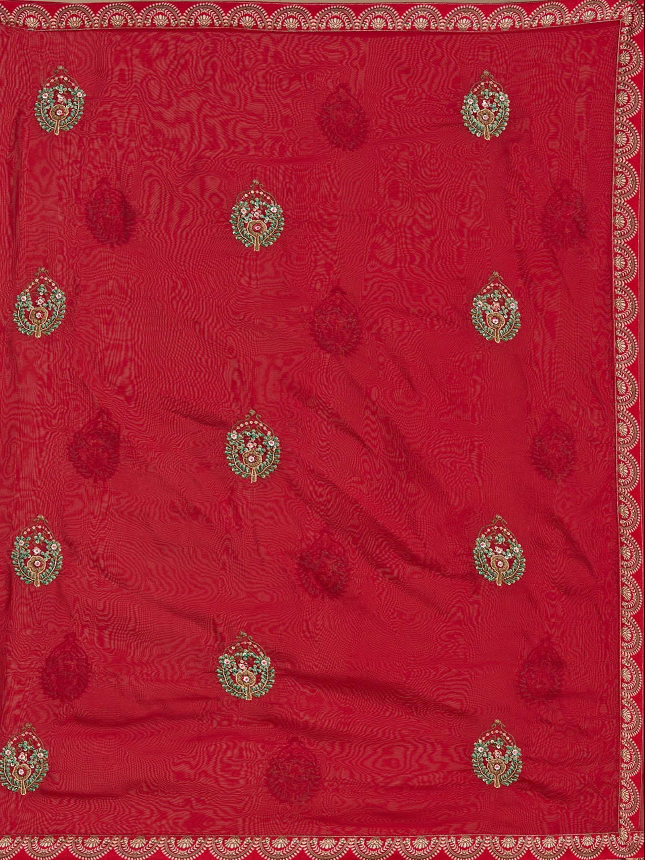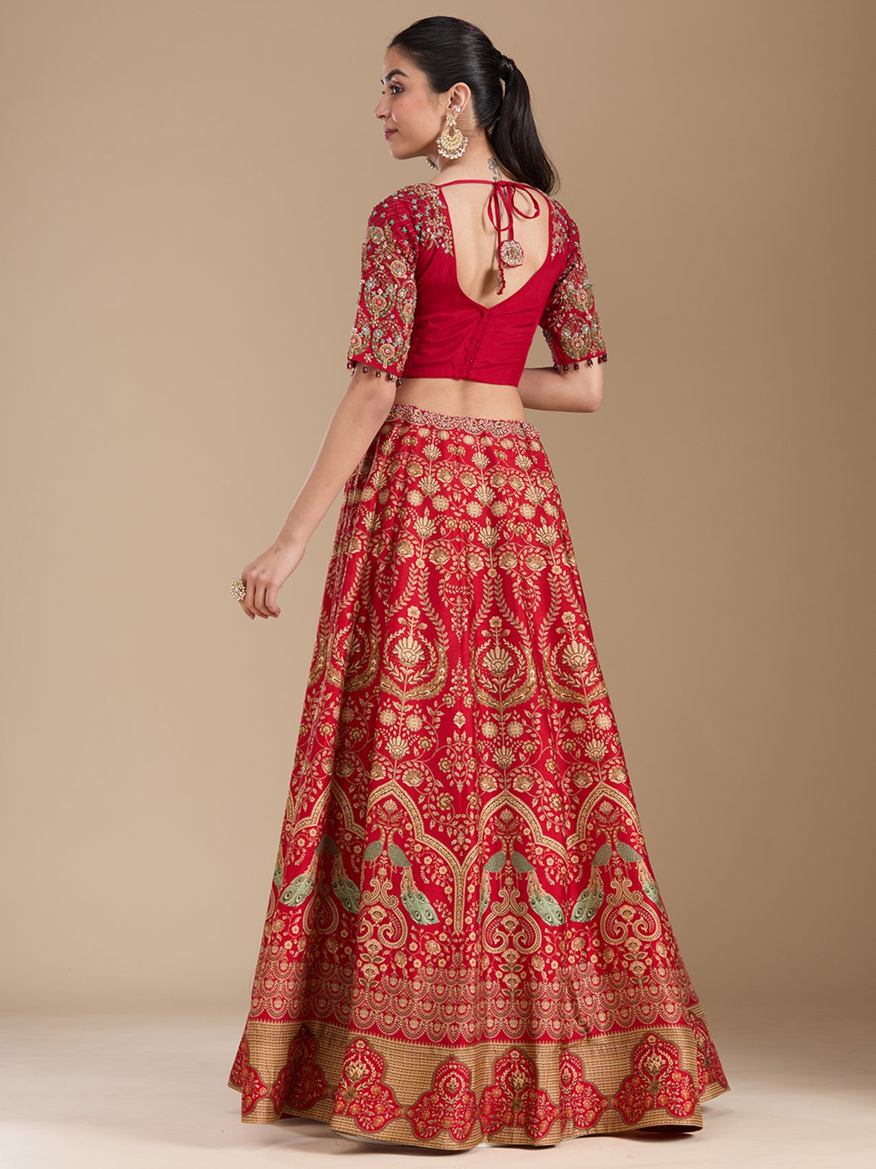 Red Readymade Lehenga in Art Silk fabric. The Lehenga is embellished with Threadwork embroidery. Accompanied with an Readymade blouse and dupatta. Comes with the Koskii promise of premium quality.