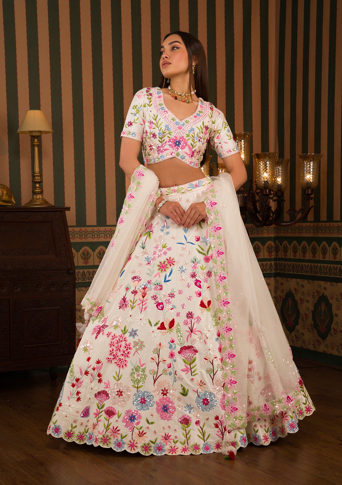Step into the spotlight with Koskii's radiant Raw Silk Lehenga, where traditional threadwork meets the spirited joy of lush florals. Each swirl of your sumptuous skirt tells a story of craftsmanship and elegance, wrapped in the comfort of luxurious silk. Perfect for those who adore vibrant expressions of style and celebrate life with every colorful thread!