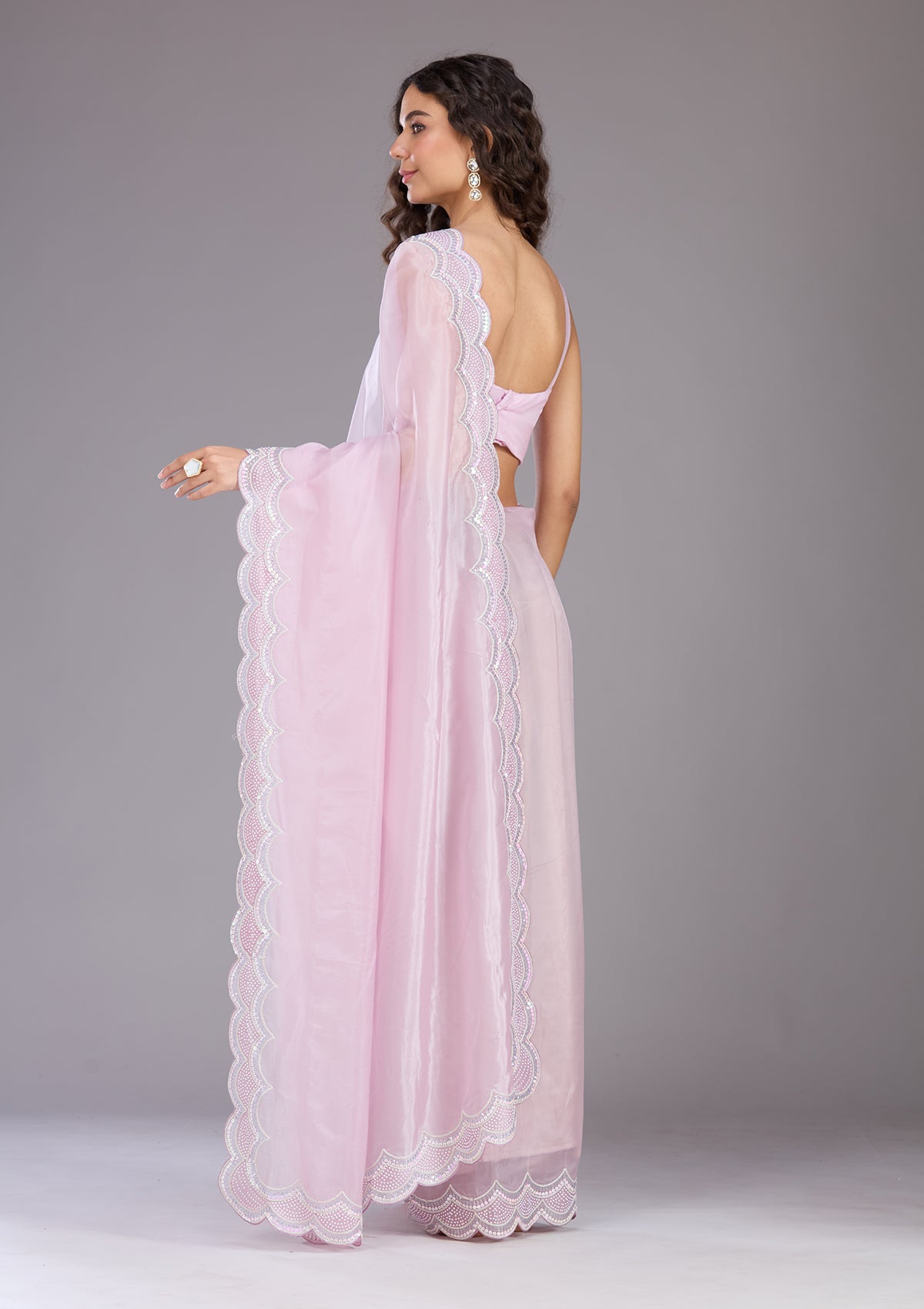 Lavender Saree in Organza fabric. The Saree is elevated with Sequins embroidery. It comes with an Unstitched blouse. Comes with the Koskii promise of premium quality.