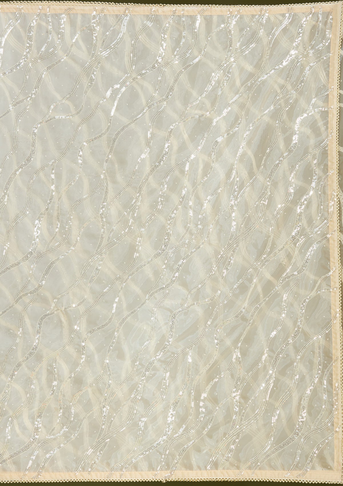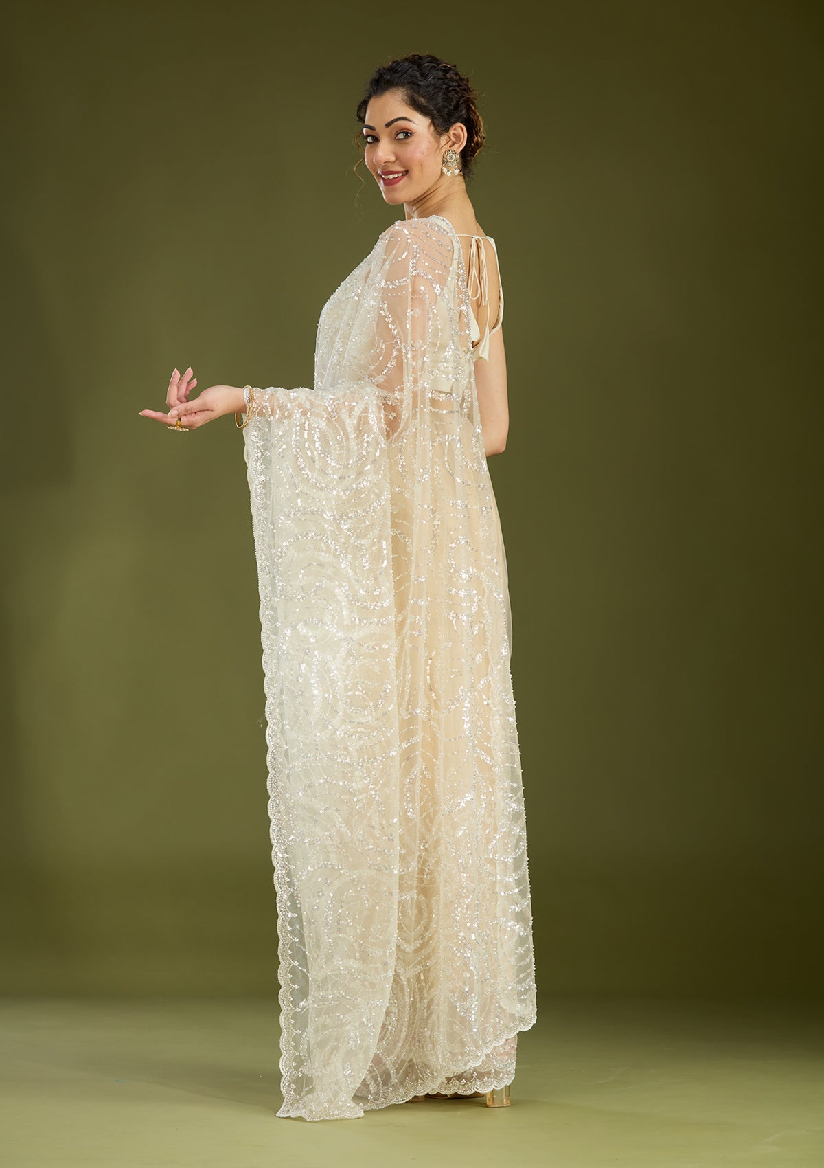 Off White Saree in Net fabric. The Saree is elevated with Sequins embroidery. It comes with an Unstitched blouse. Comes with the Koskii promise of premium quality.