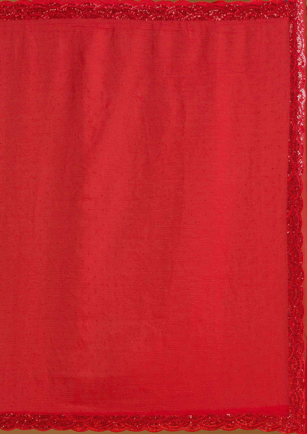 Red Saree in Chiffon fabric. The Saree is elevated with Sequins embroidery. It comes with an Unstitched blouse. Comes with the Koskii promise of premium quality.
