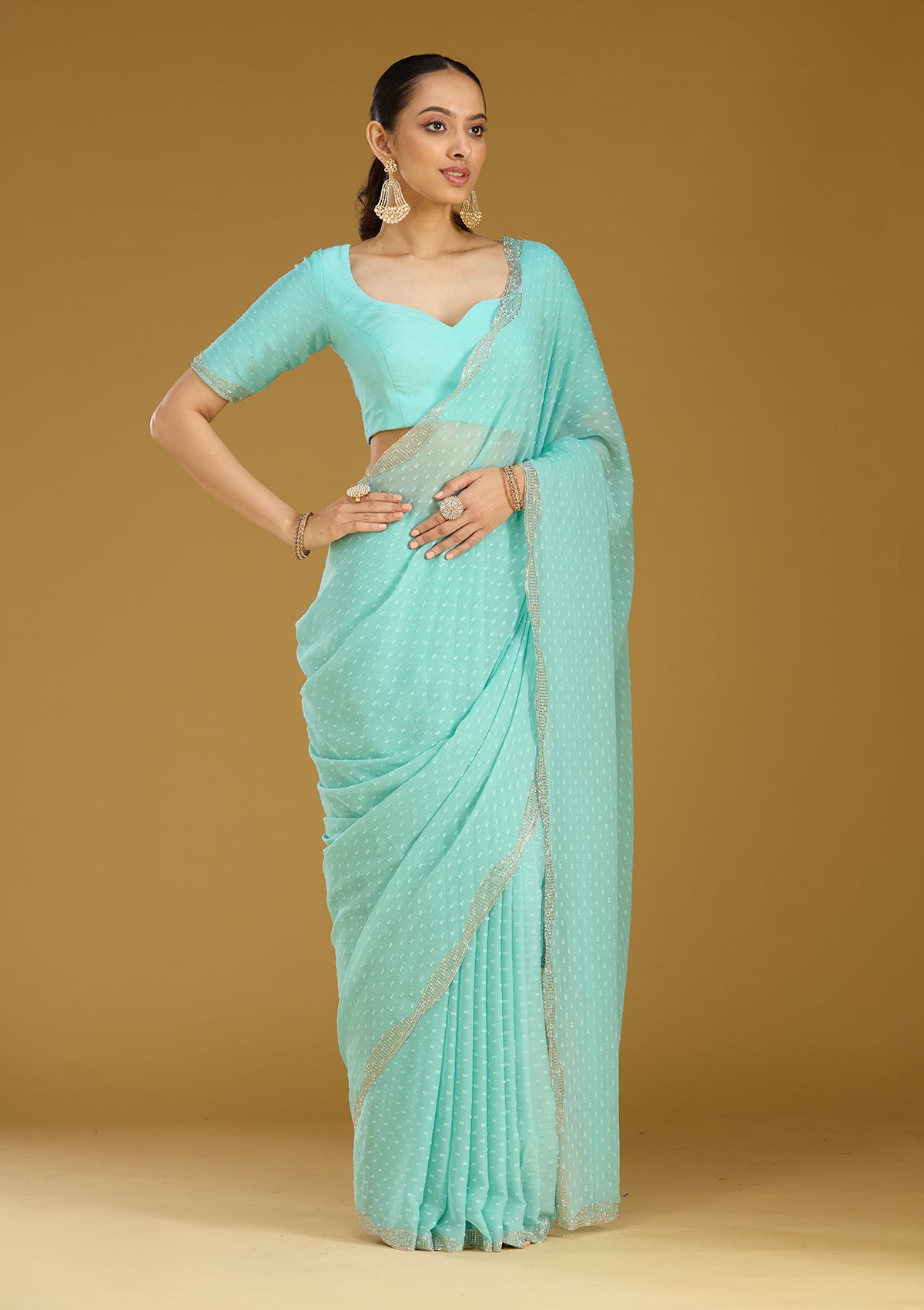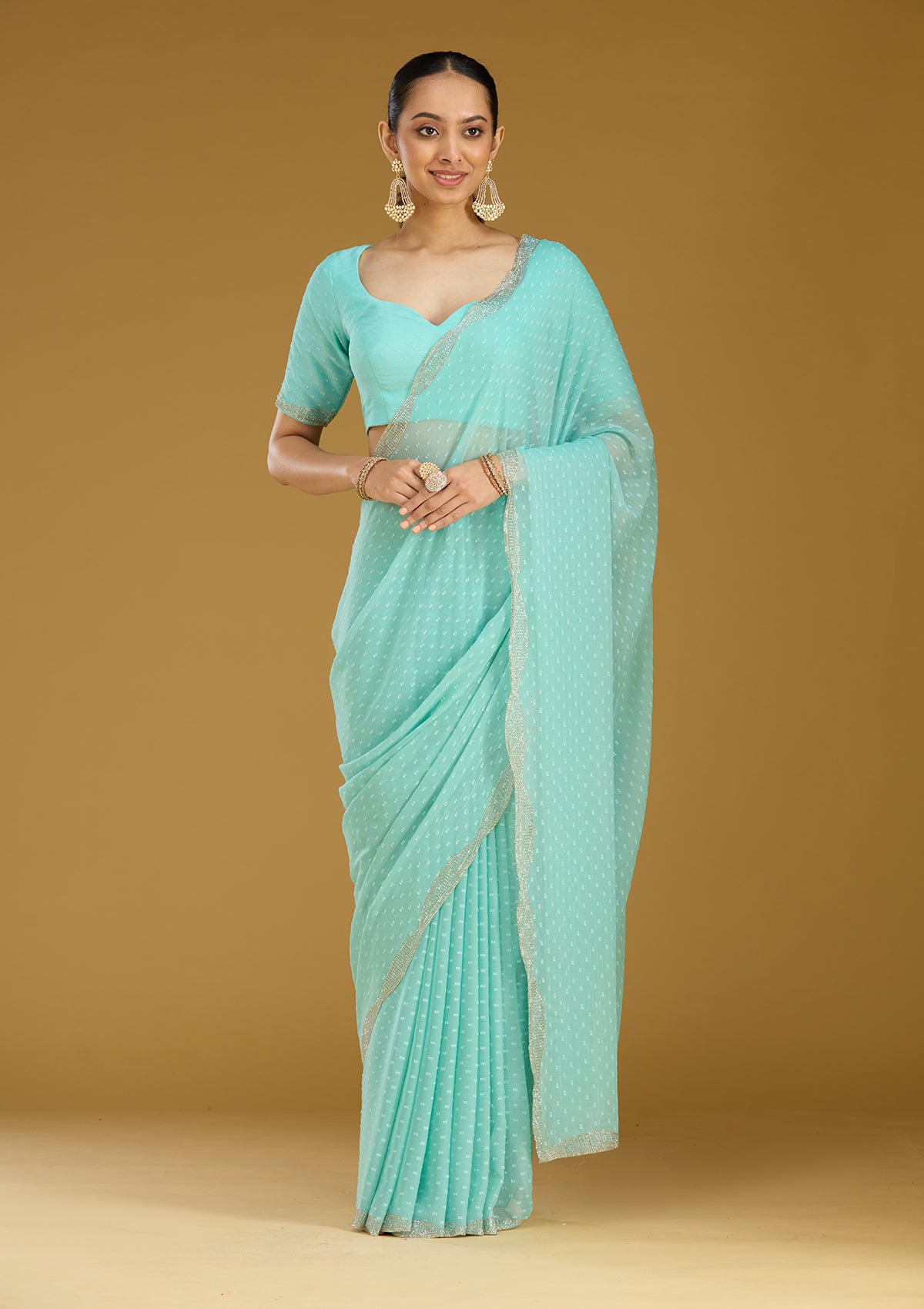 Sea Green Saree in Chiffon fabric. The Saree is elevated with Stonework (Silver) embroidery. It comes with an Unstitched blouse. Comes with the Koskii promise of premium quality.