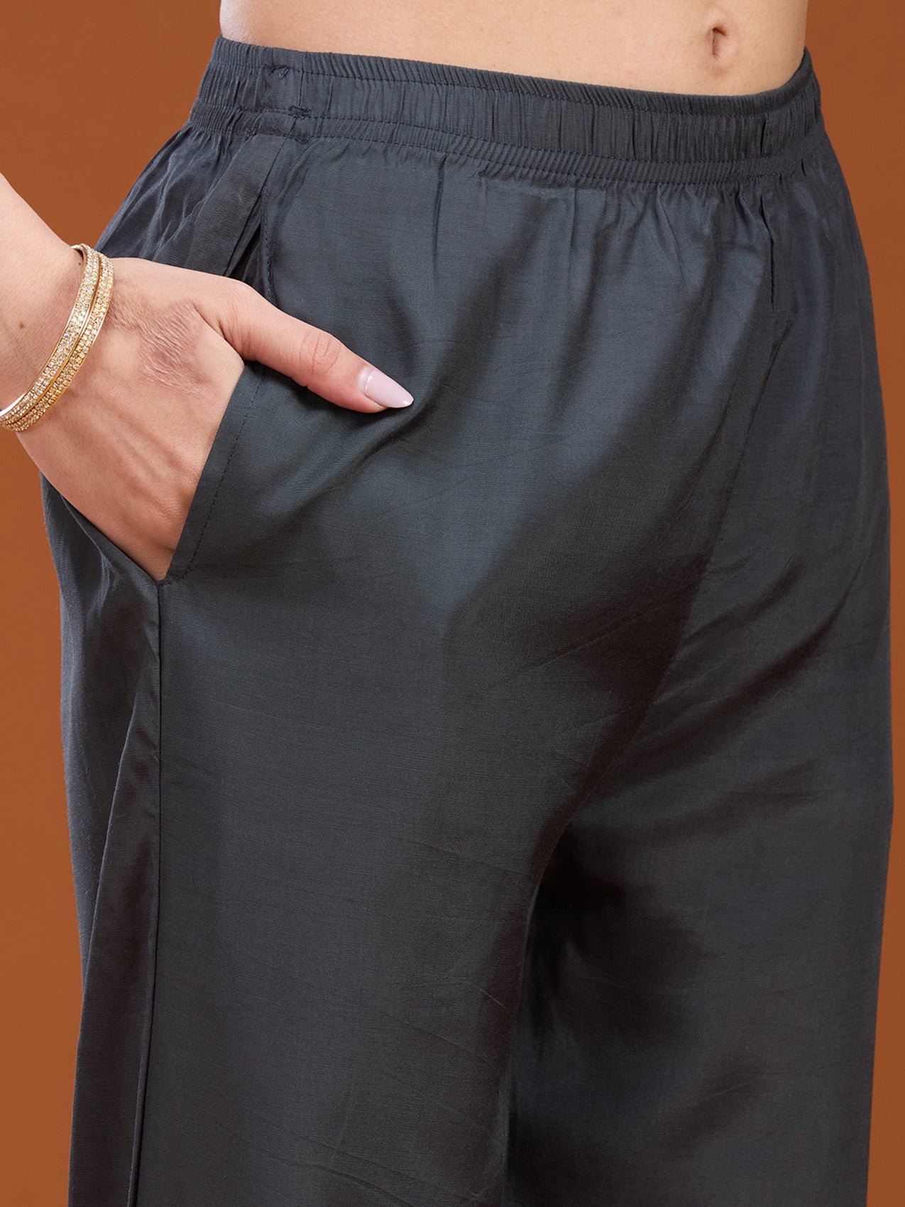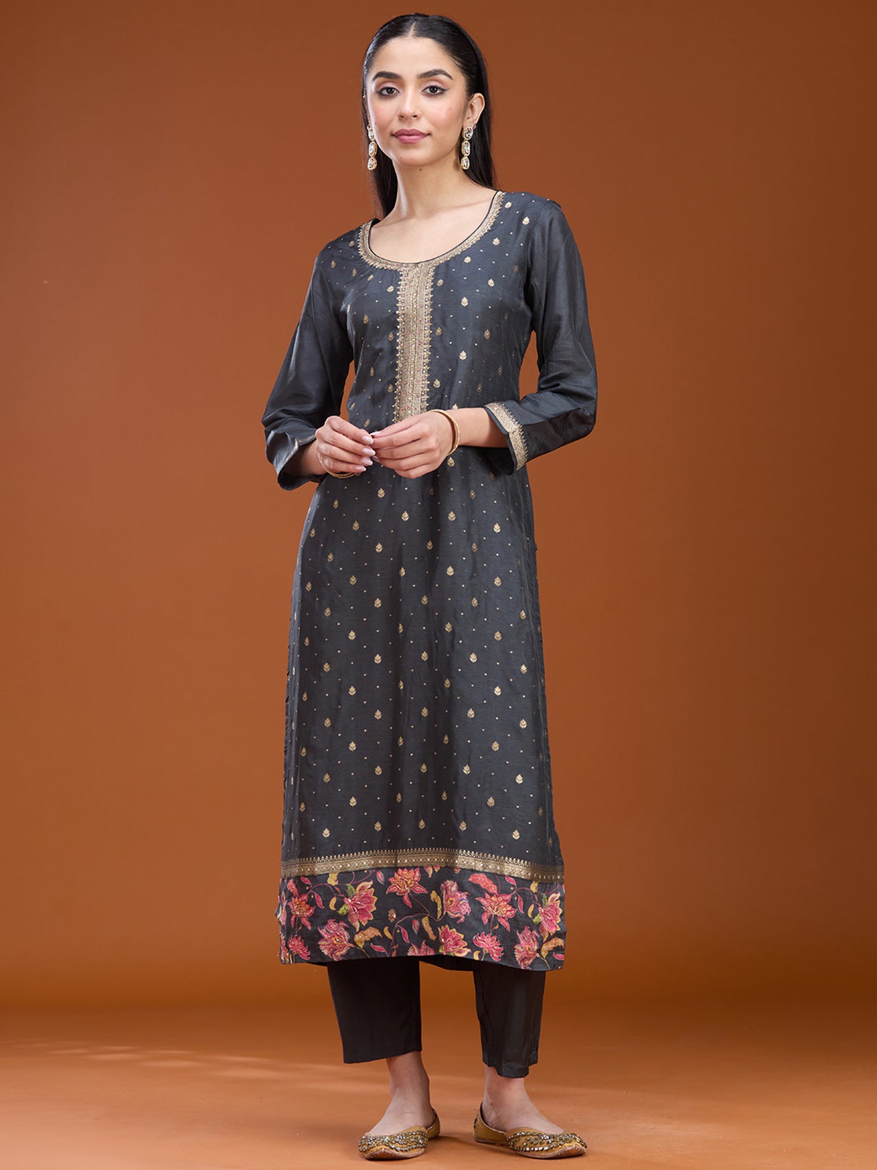 Dark Grey Salwar Suit in Soft Raw Silk fabric. The Salwar Suit is embellished with Stonework (Gold) embroidery. Accompanied with a bottom and dupatta. Comes with the Koskii promise of premium quality.