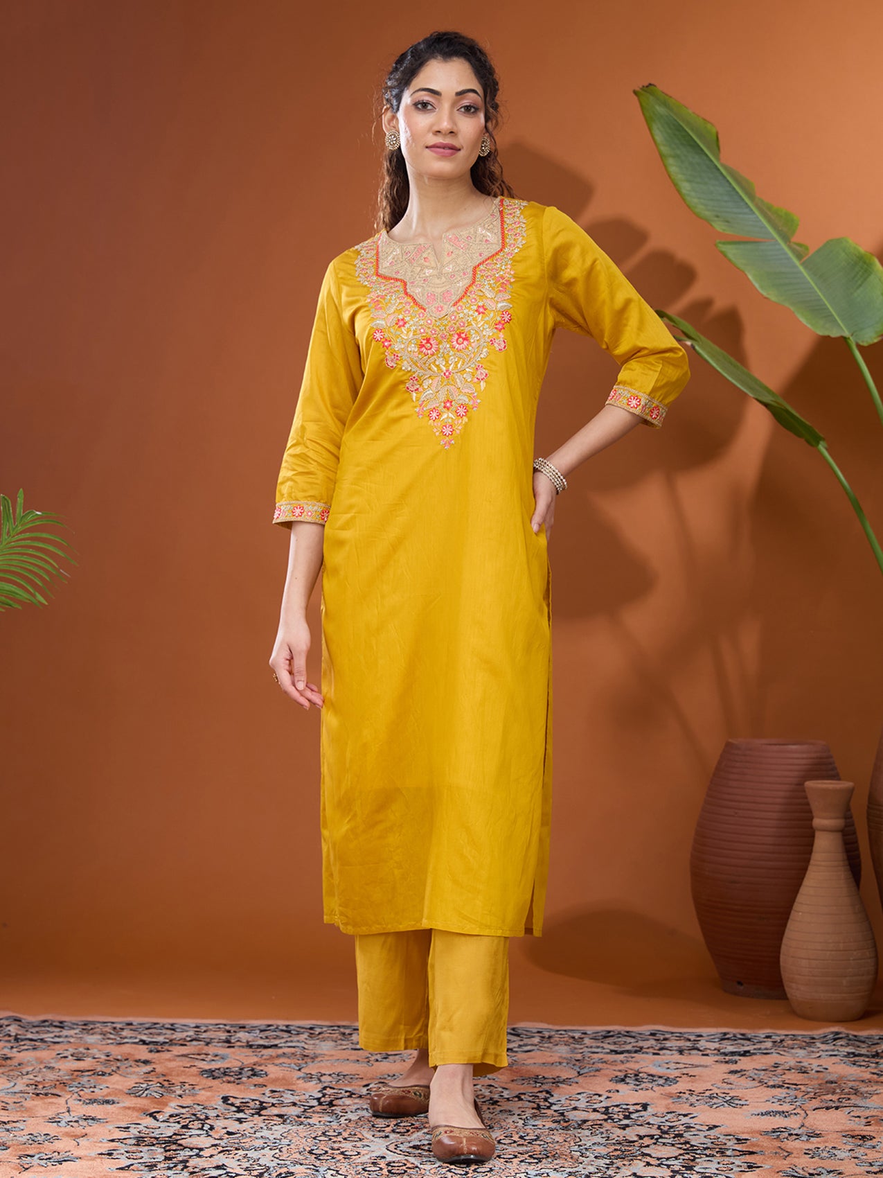 Mustard Yellow Salwar Suit in Chanderi fabric. The Salwar Suit is embellished with Threadwork embroidery. Accompanied with a bottom and dupatta. Comes with the Koskii promise of premium quality.