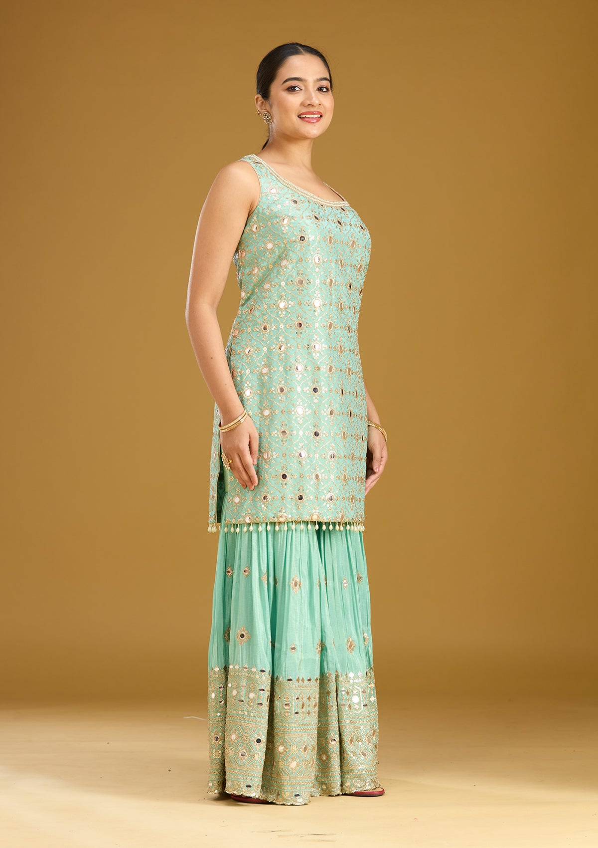 Sea Green Mirrorwork Tissue Readymade Salwar Suit