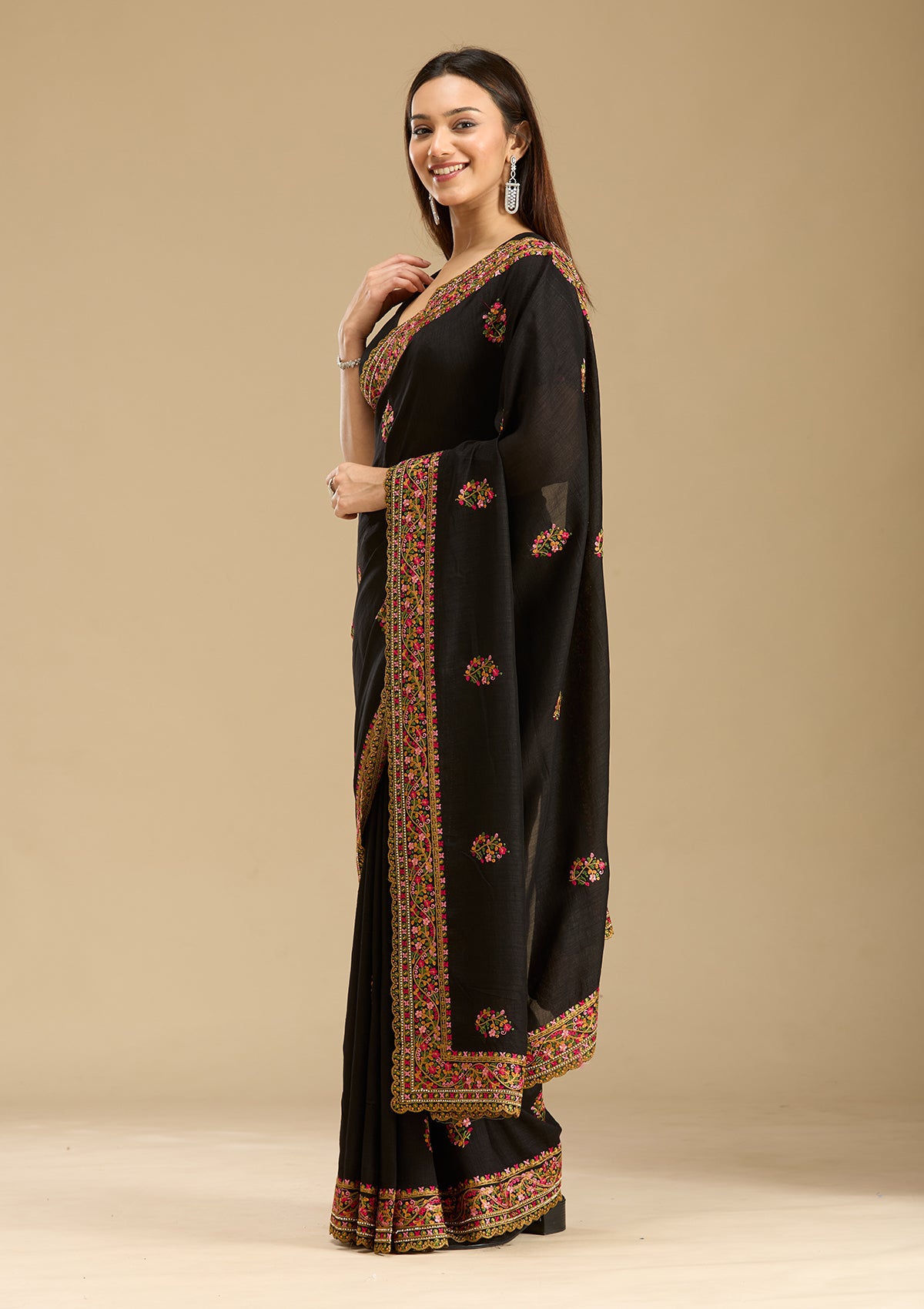 Black Saree in Soft Raw Silk fabric The Saree is elevated with Kashmiri embroidery It comes with an Unstitched blouse Comes with the Koskii promise of premium quality.