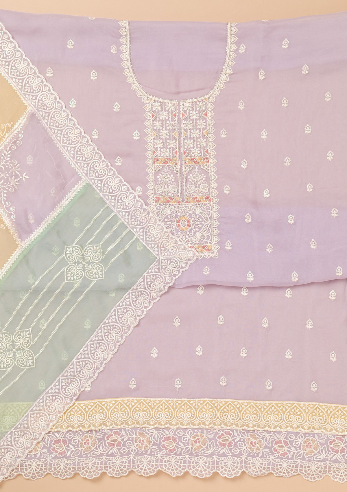 Lavender Salwar Suit in Organza fabric. The Salwar Suit is embellished with Threadwork embroidery. Accompanied with a bottom and dupatta. Comes with the Koskii promise of premium quality.
