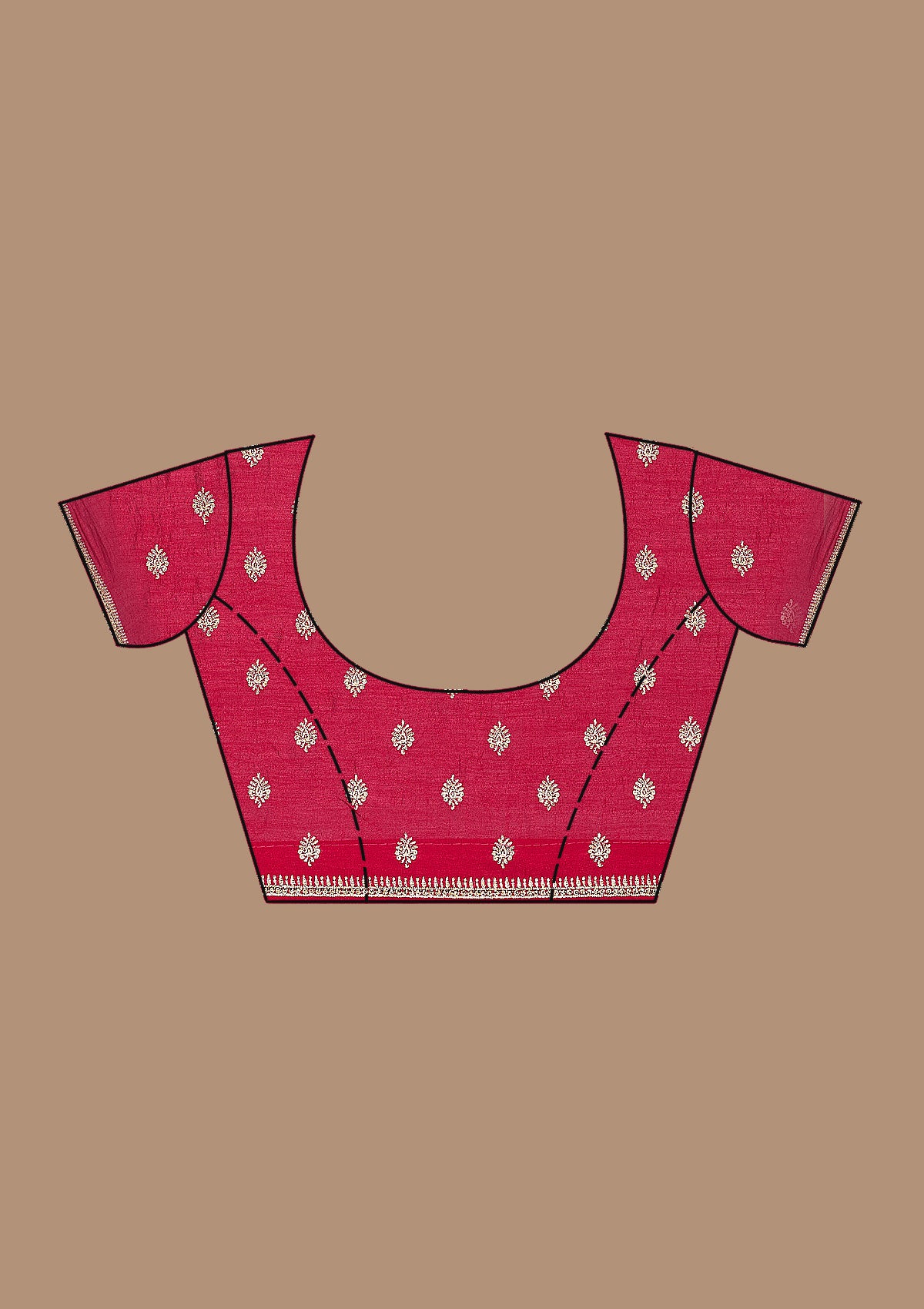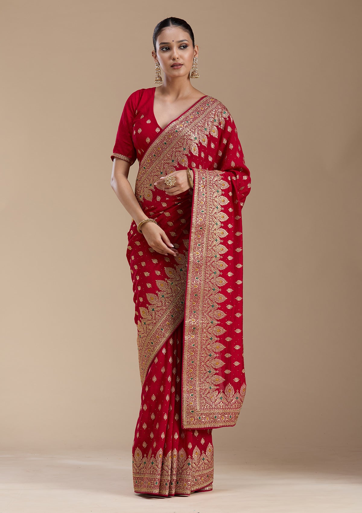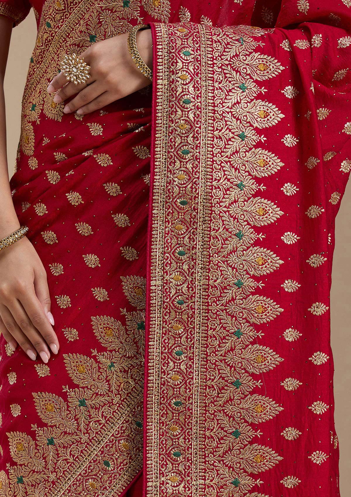 Red Saree in Soft Raw Silk fabric. The Saree is elevated with Zariwork (Gold) embroidery. It comes with an Unstitched blouse. Comes with the Koskii promise of premium quality.