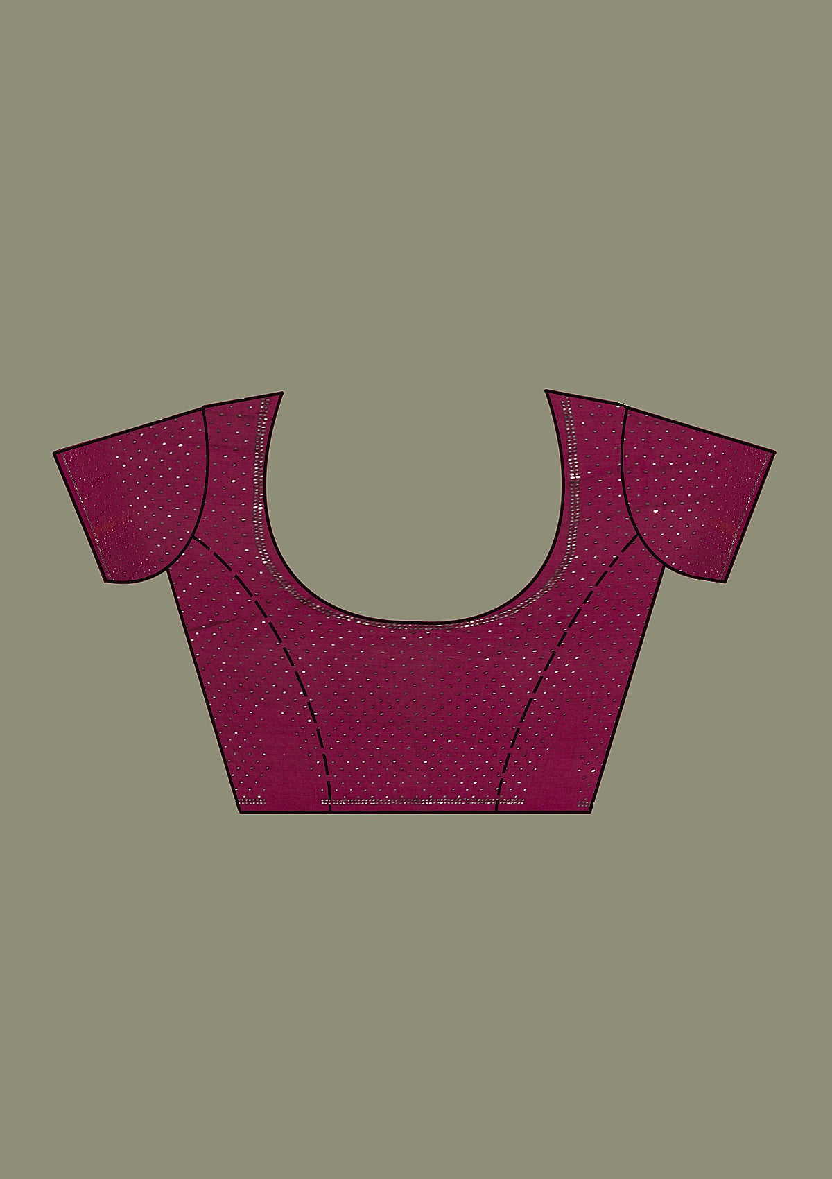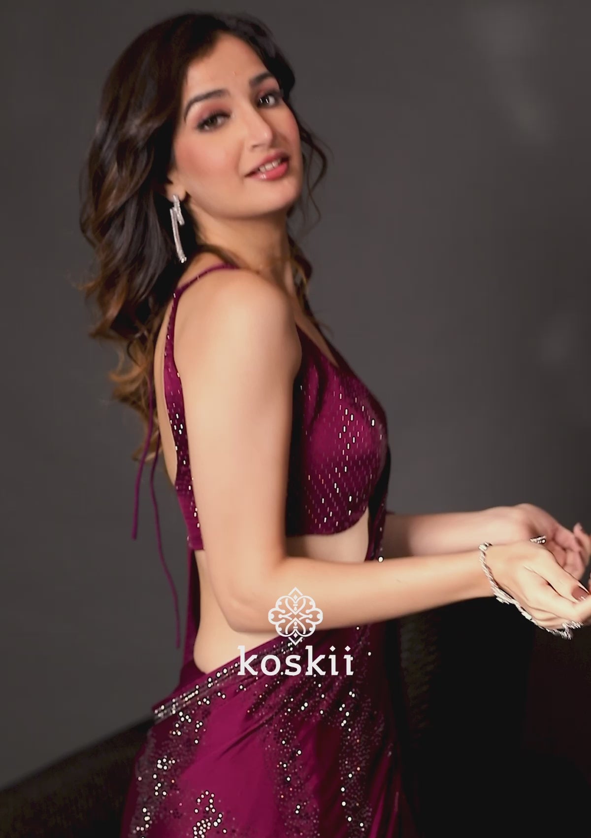 Dazzle in Koskii’s magenta semi crepe saree, where tradition meets glamour! This enchanting drape is sprinkled with luxurious SWAROVSKI embroidery, radiating a charm that’s both captivating and uniquely yours. Perfect for making a vibrant statement at any celebratory occasion, its sleek fabric and sparkling details promise to turn heads and elevate your ethnic wardrobe with an unmatched elegance.