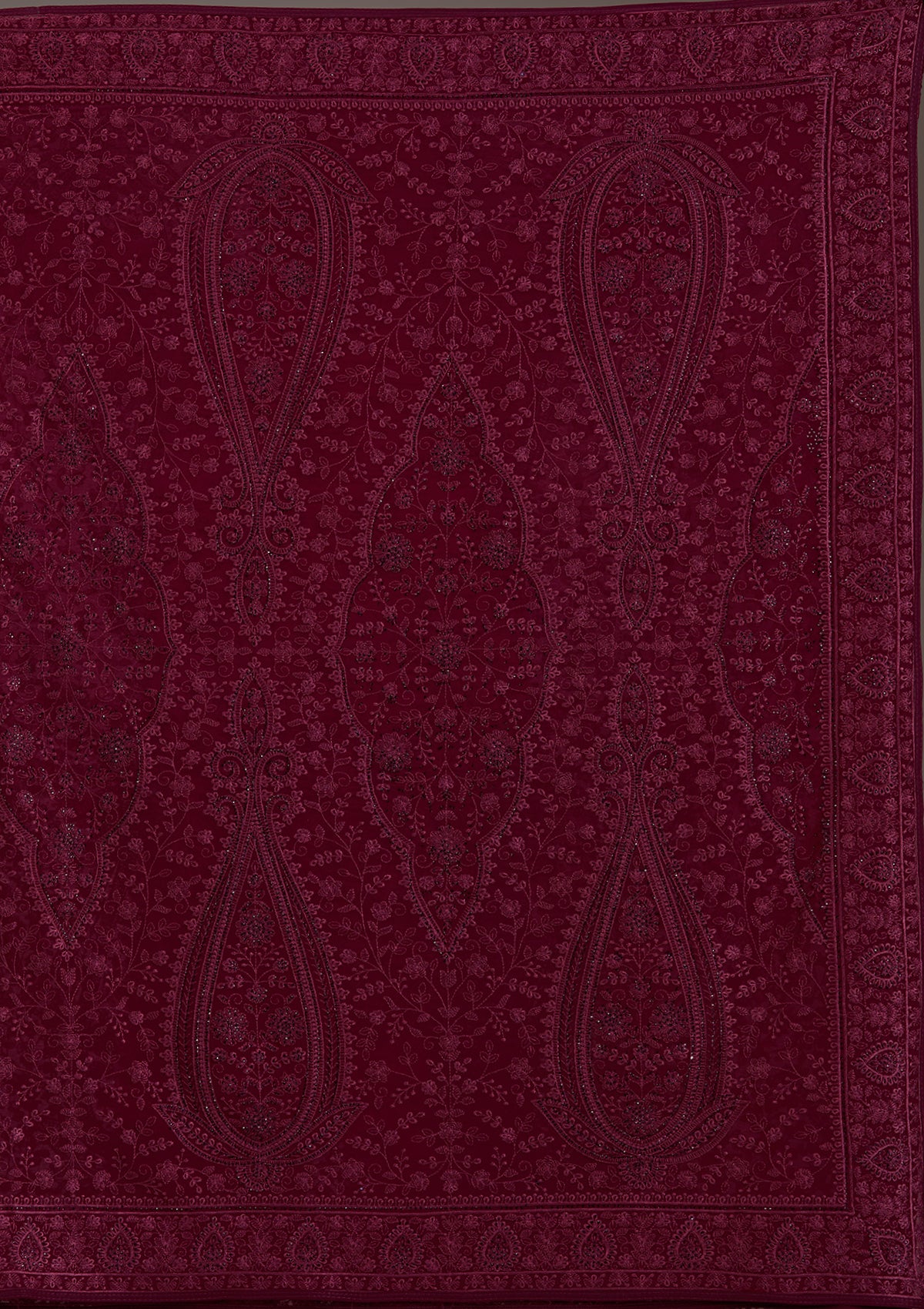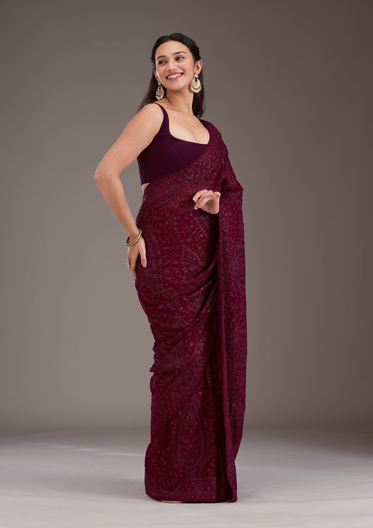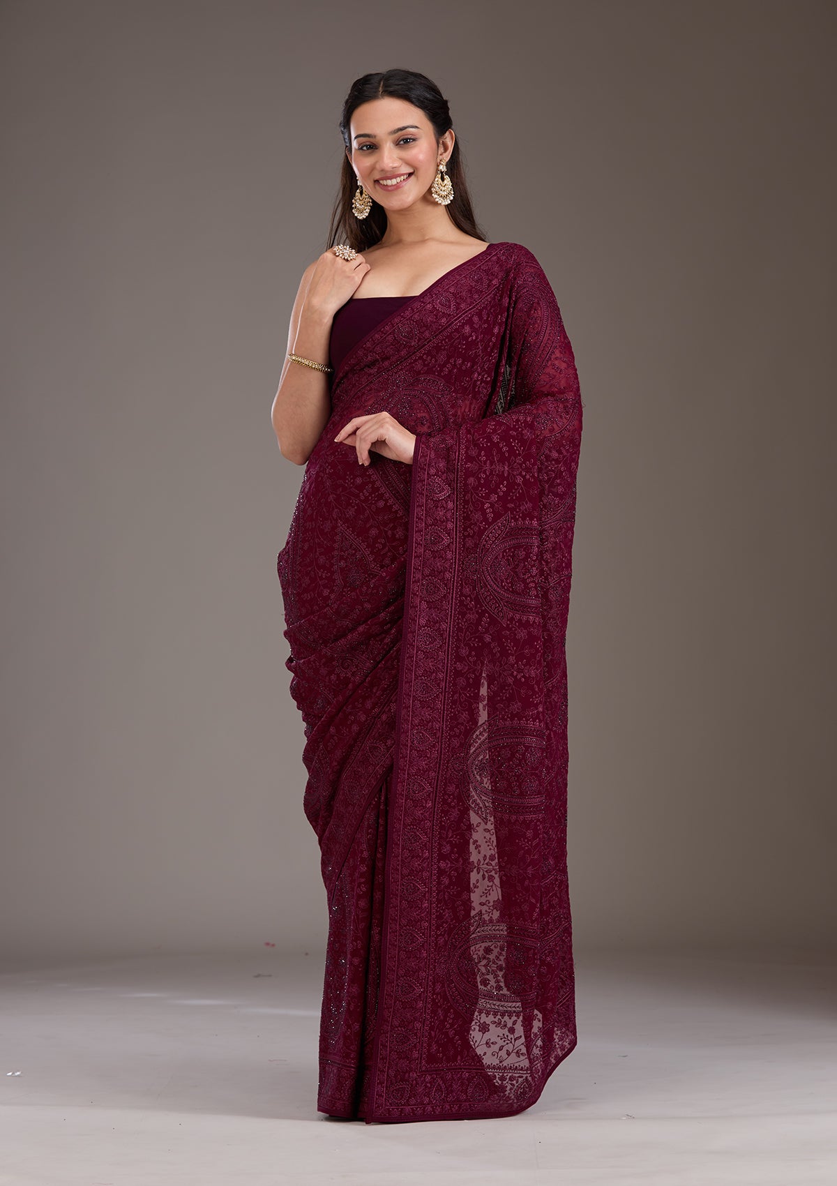 Step into a world of vibrant elegance with Koskii’s Maroon Georgette Saree, adorned with exquisite threadwork that dances across the fabric like playful whispers of luxury. Perfect for those who love to express themselves with a pop of color and a dash of tradition, this saree offers a seamless blend of comfort and glamour. Whether it’s a spontaneous celebration or a cherished gathering, wrap yourself in the spirit of joy that only a Koskii saree can bring!.