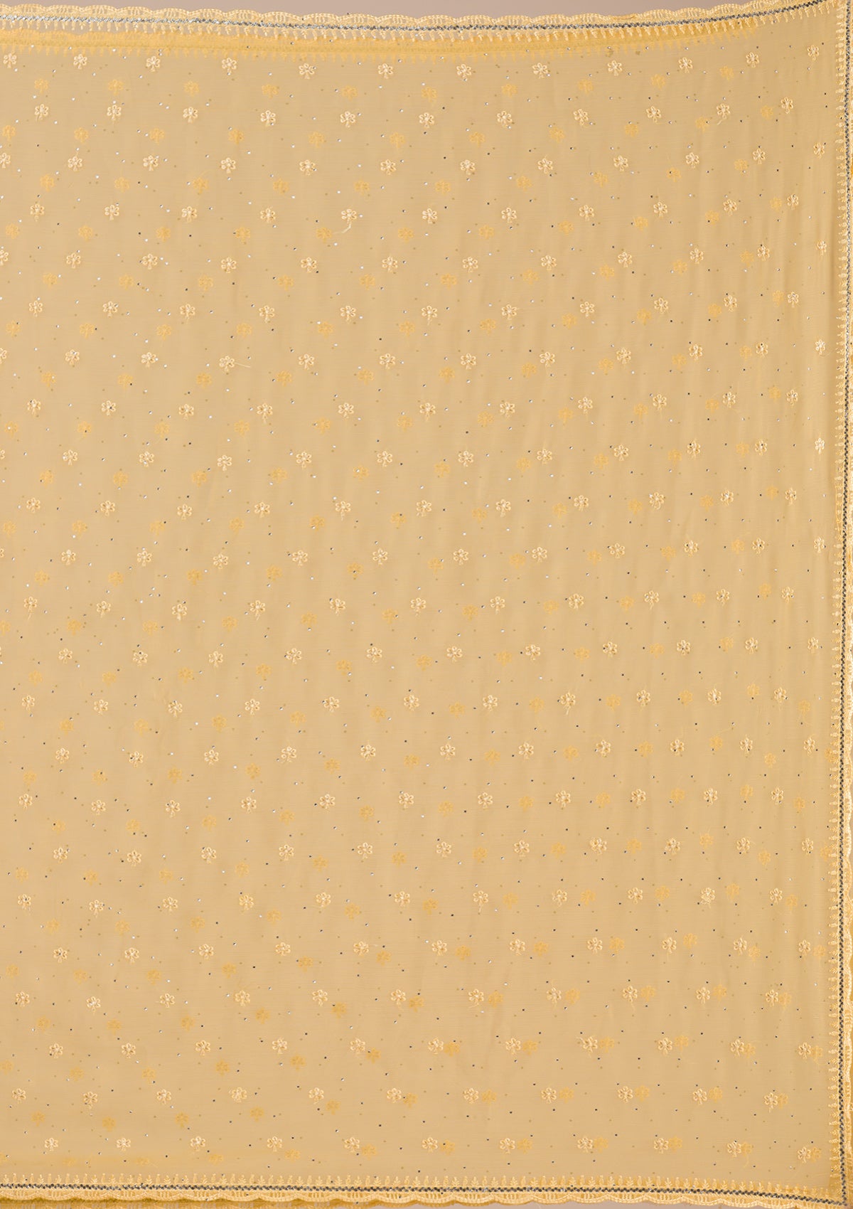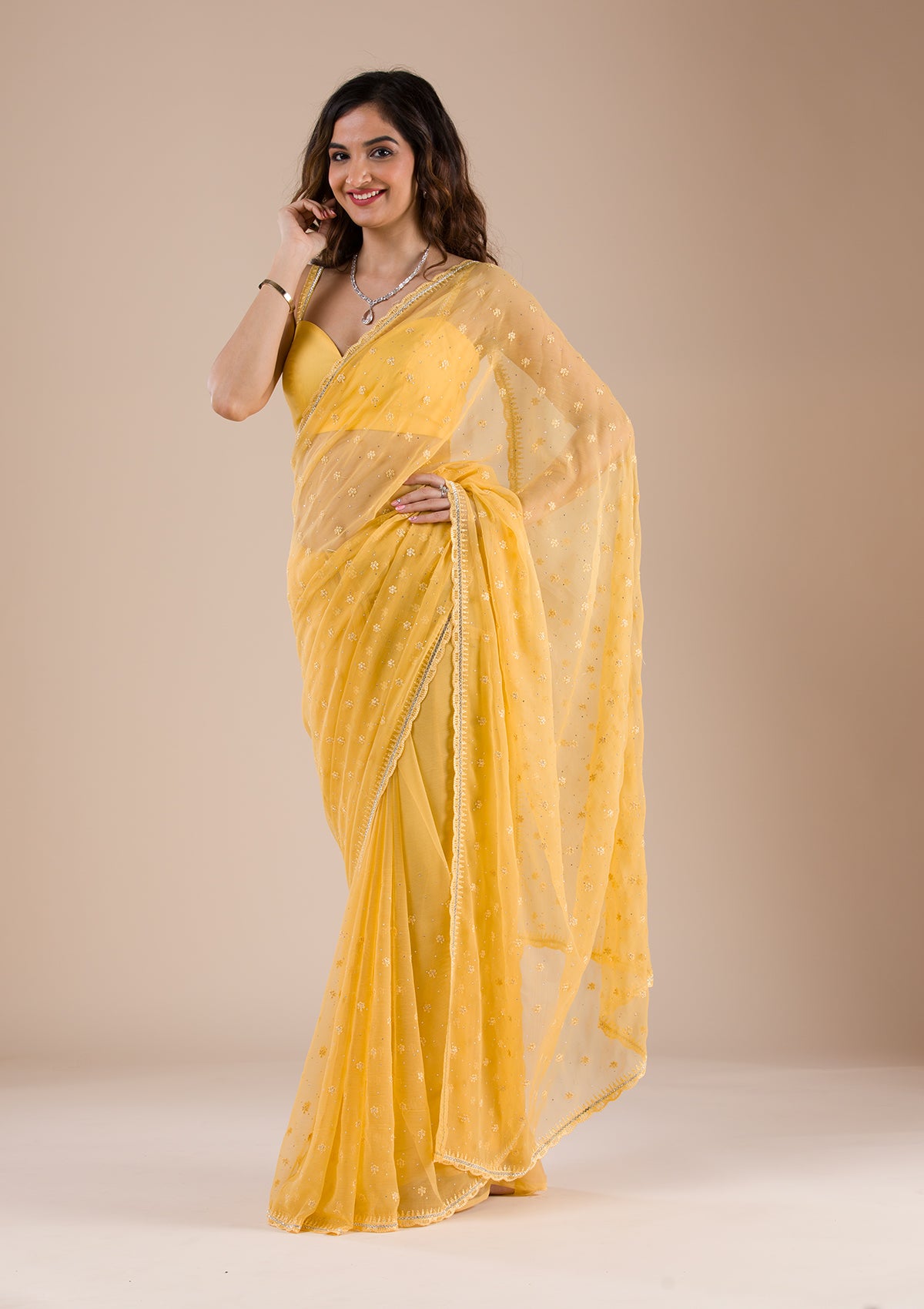Unveil your vibrant spirit with Koskii’s Chiffon Yellow Saree, where the allure of delicate threadwork meets the sheer bliss of chiffon! Drape yourself in this flowy delight that's as playful as a summer breeze and as striking as a sunset. This exceptional piece is perfect for those who love to stand out in sheer elegance, making every moment a celebration of style and grace.