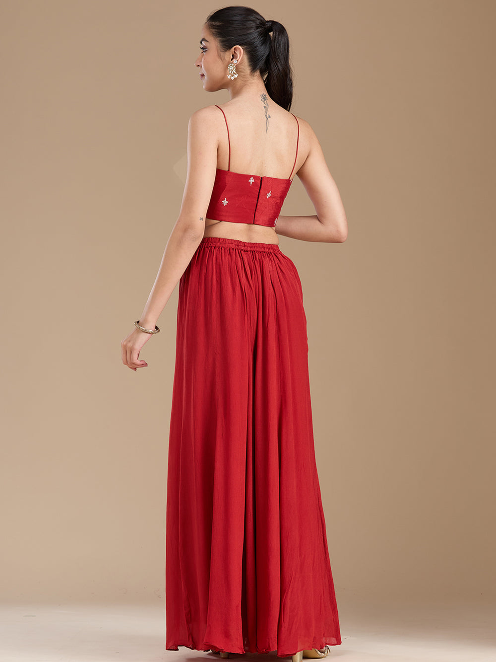 - Earthy Tones: Palazzo suits in earthy tones like olive green, rust, and brown are perfect for a chic, understated look. These colours are versatile and can be dressed up or down depending on the occasion. Pair with minimalistic jewellery and natural makeup for a polished appearance.