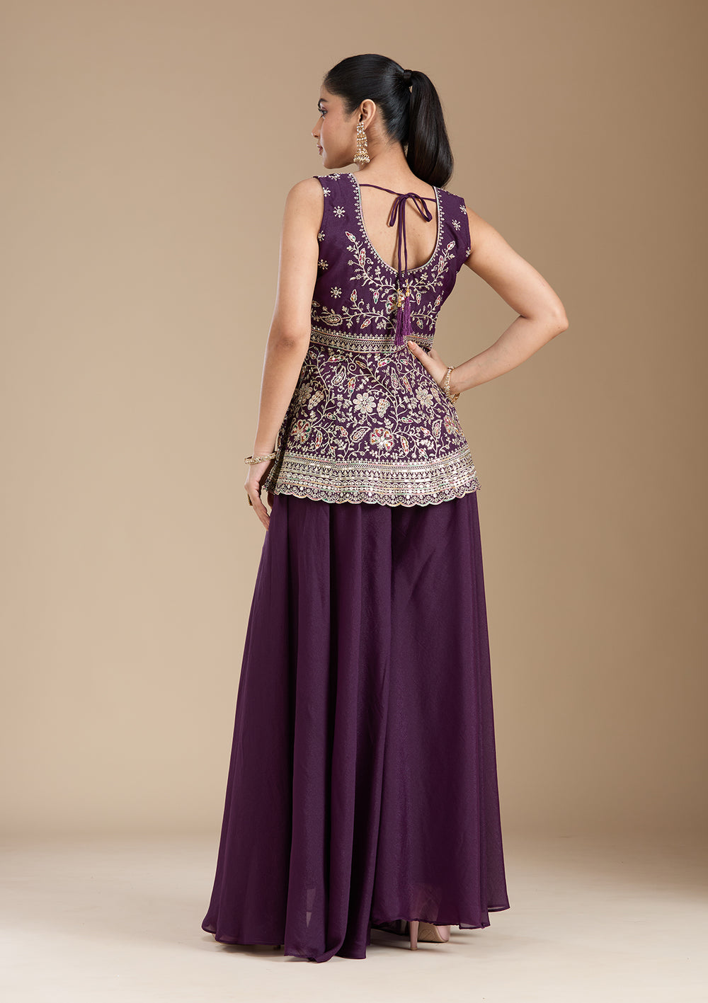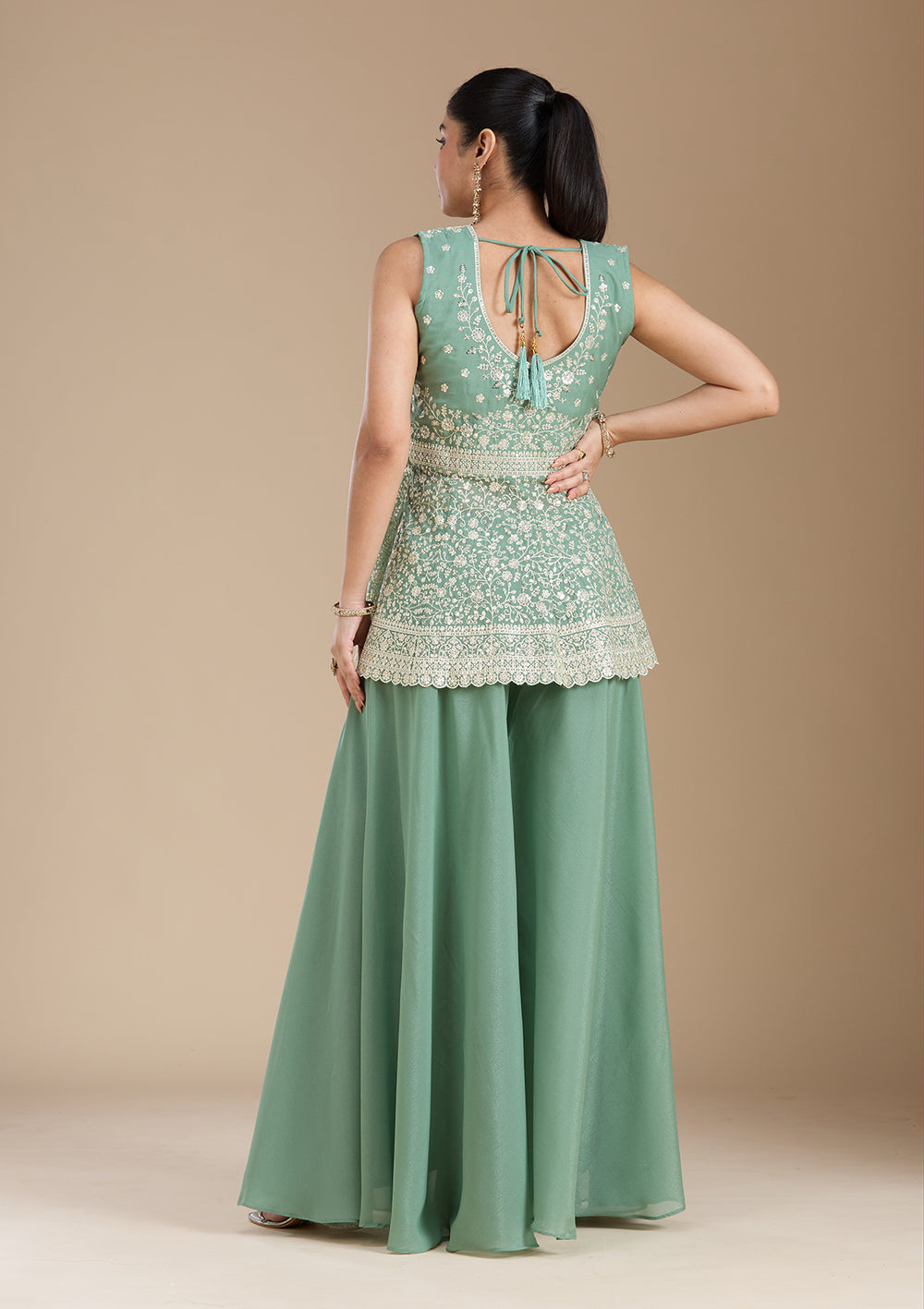 - Flared Harem Palazzo Suits: This palazzo dress offers a skirt-like appearance that resembles the sharara. You can pair them with short-length kurtas for traditional events. At Koskii, you will find a gorgeous, flared harem-style palazzo suit teamed with a glittery crop top and long jacket to amp up your night look. Or pick our white palazzo party wear suit to create a unique style statement on your deep night parties.