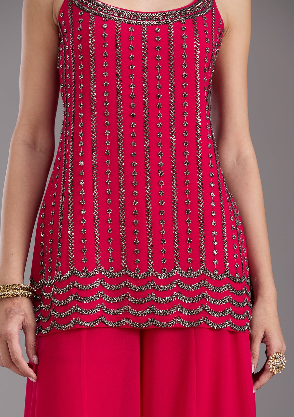 Rani Pink Salwar Suit in Georgette fabric. The Salwar Suit is embellished with Cutdana embroidery. Accompanied with a bottom and dupatta. Comes with the Koskii promise of premium quality.