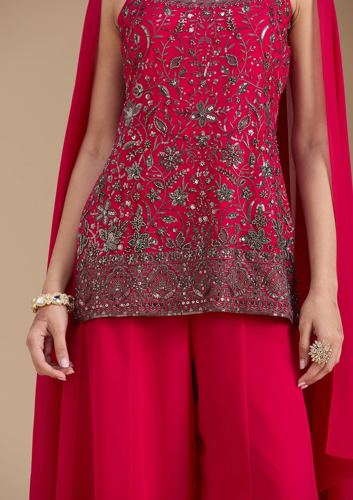 Rani Pink Salwar Suit in Georgette fabric. The Salwar Suit is embellished with Cutdana embroidery. Accompanied with a bottom and dupatta. Comes with the Koskii promise of premium quality.