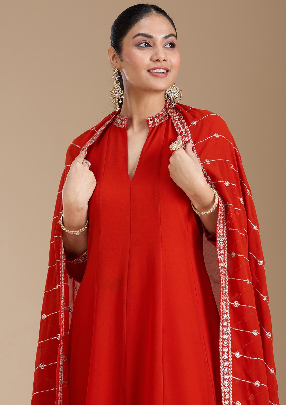 Rust Salwar Suit in Georgette fabric. The Salwar Suit is embellished with Zariwork (Gold) embroidery. Accompanied with a bottom and dupatta. Comes with the Koskii promise of premium quality.