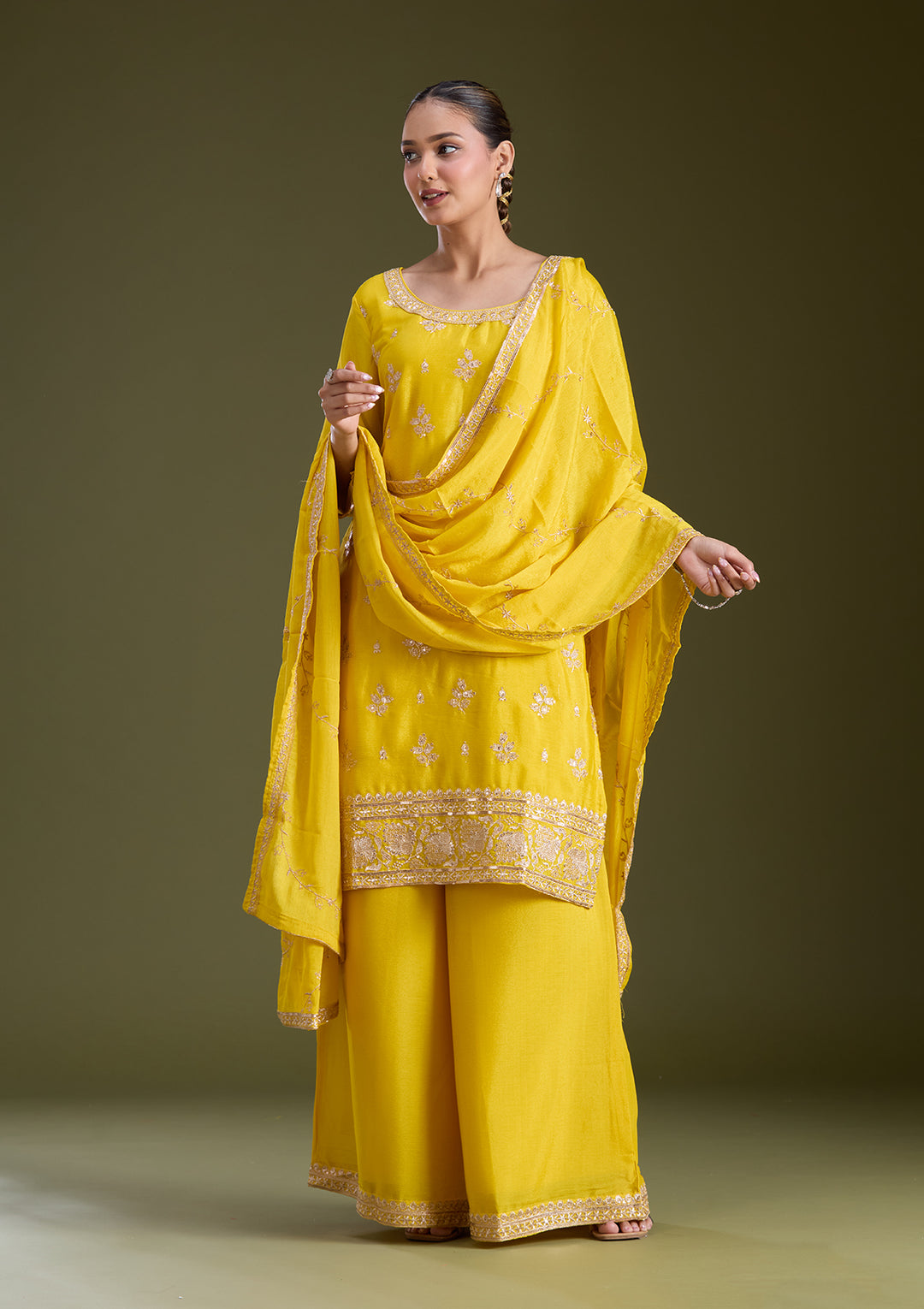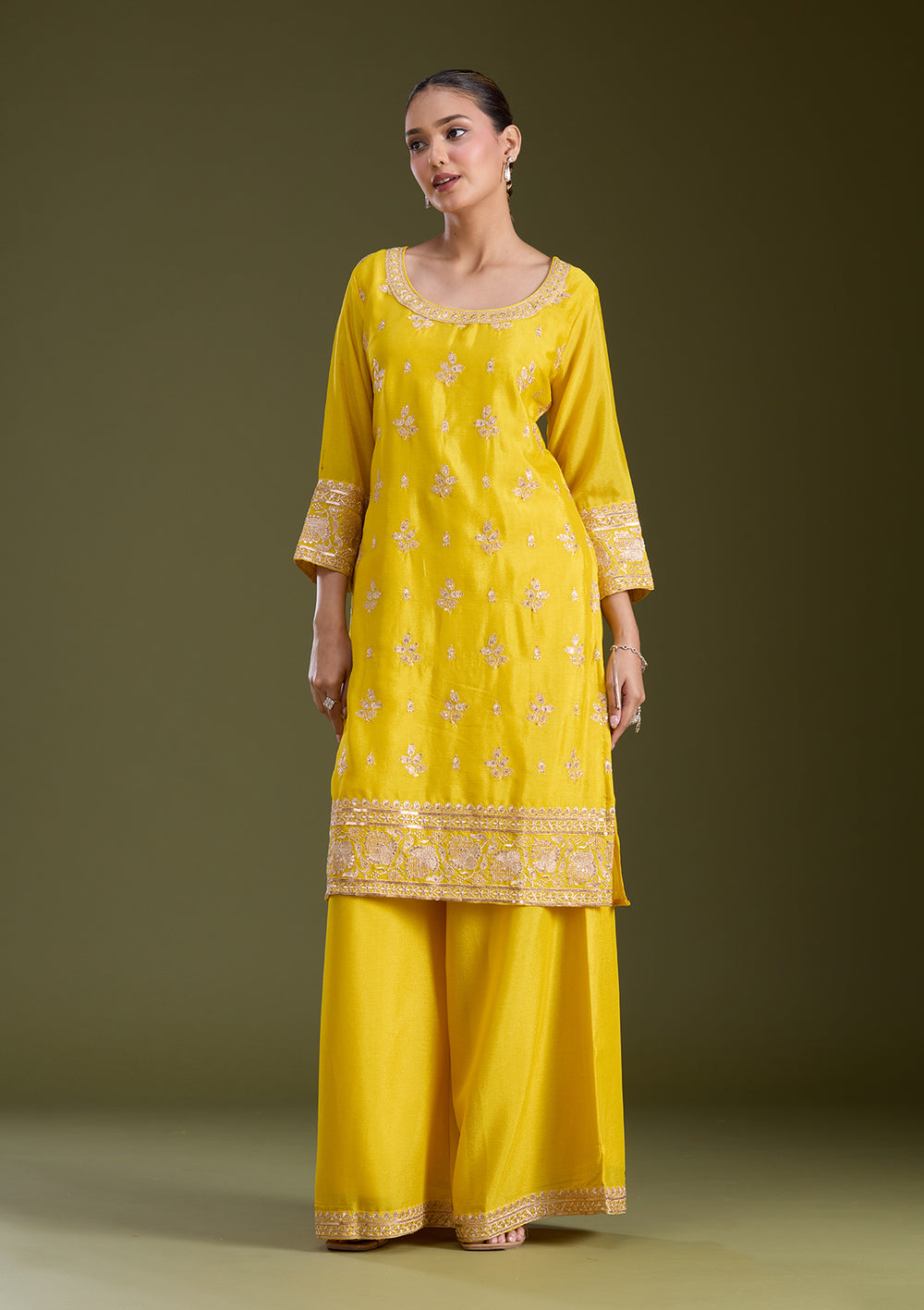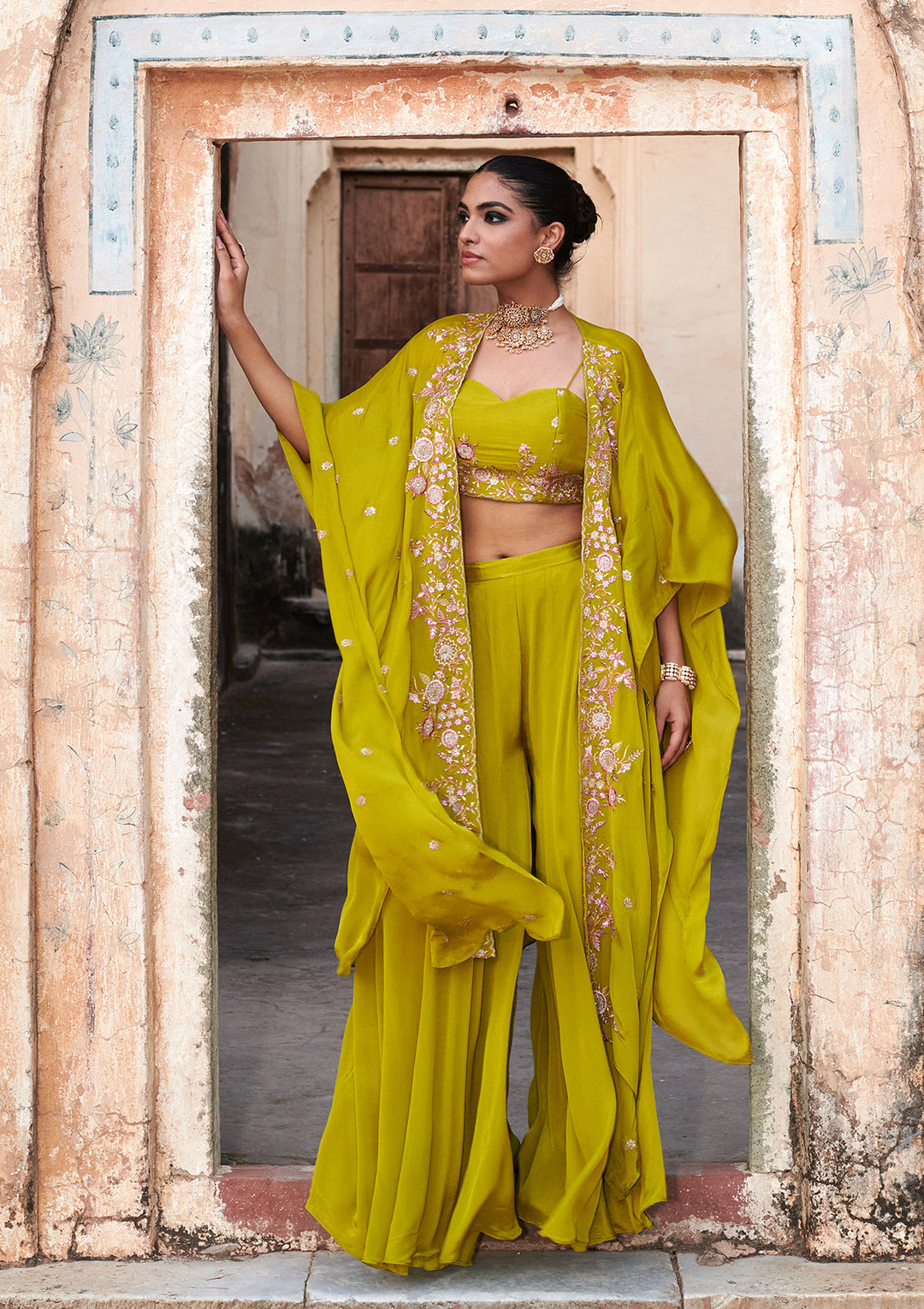 - Create a bold fashion statement at your sister’s haldi function with our gota patti palazzo set in yellow.